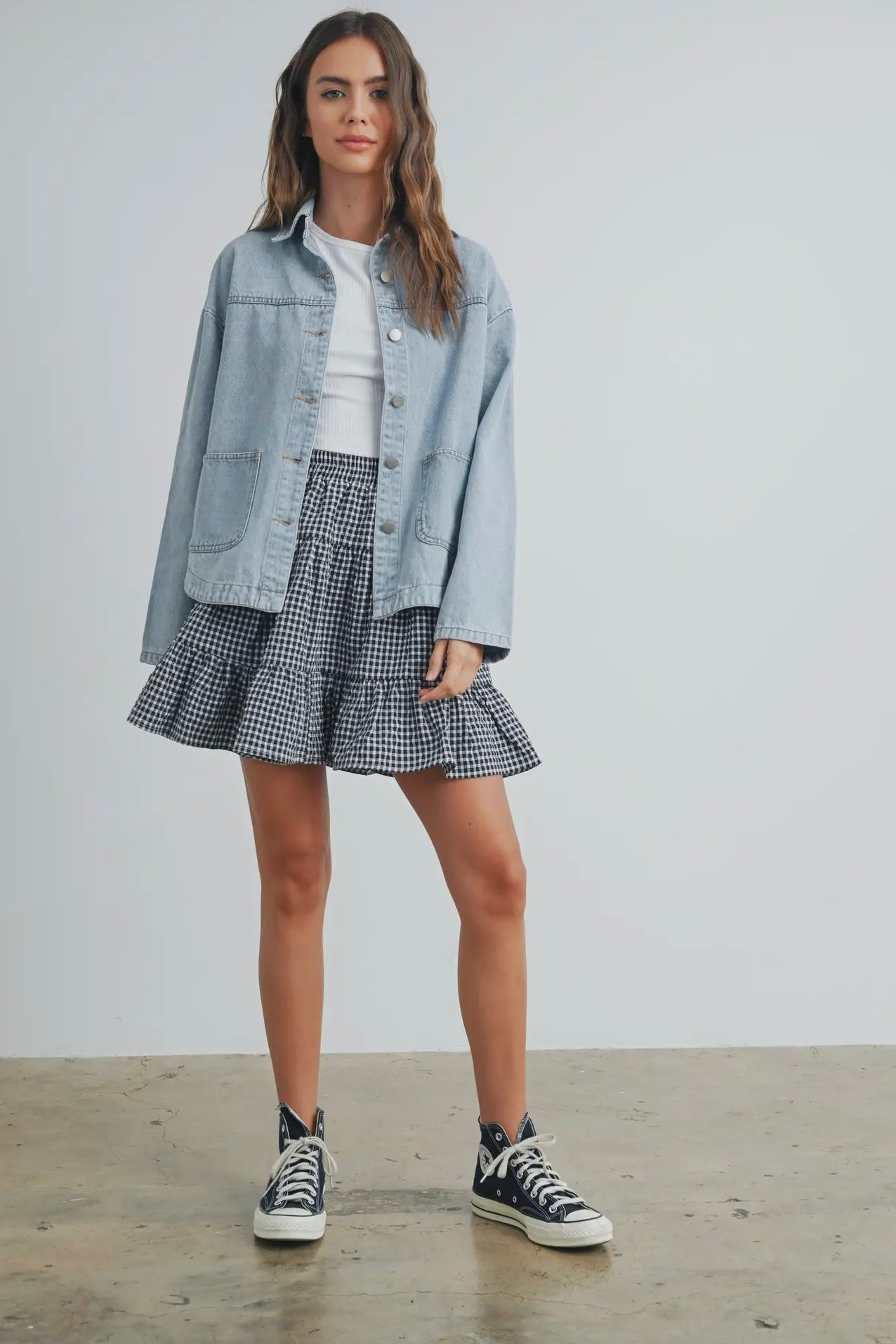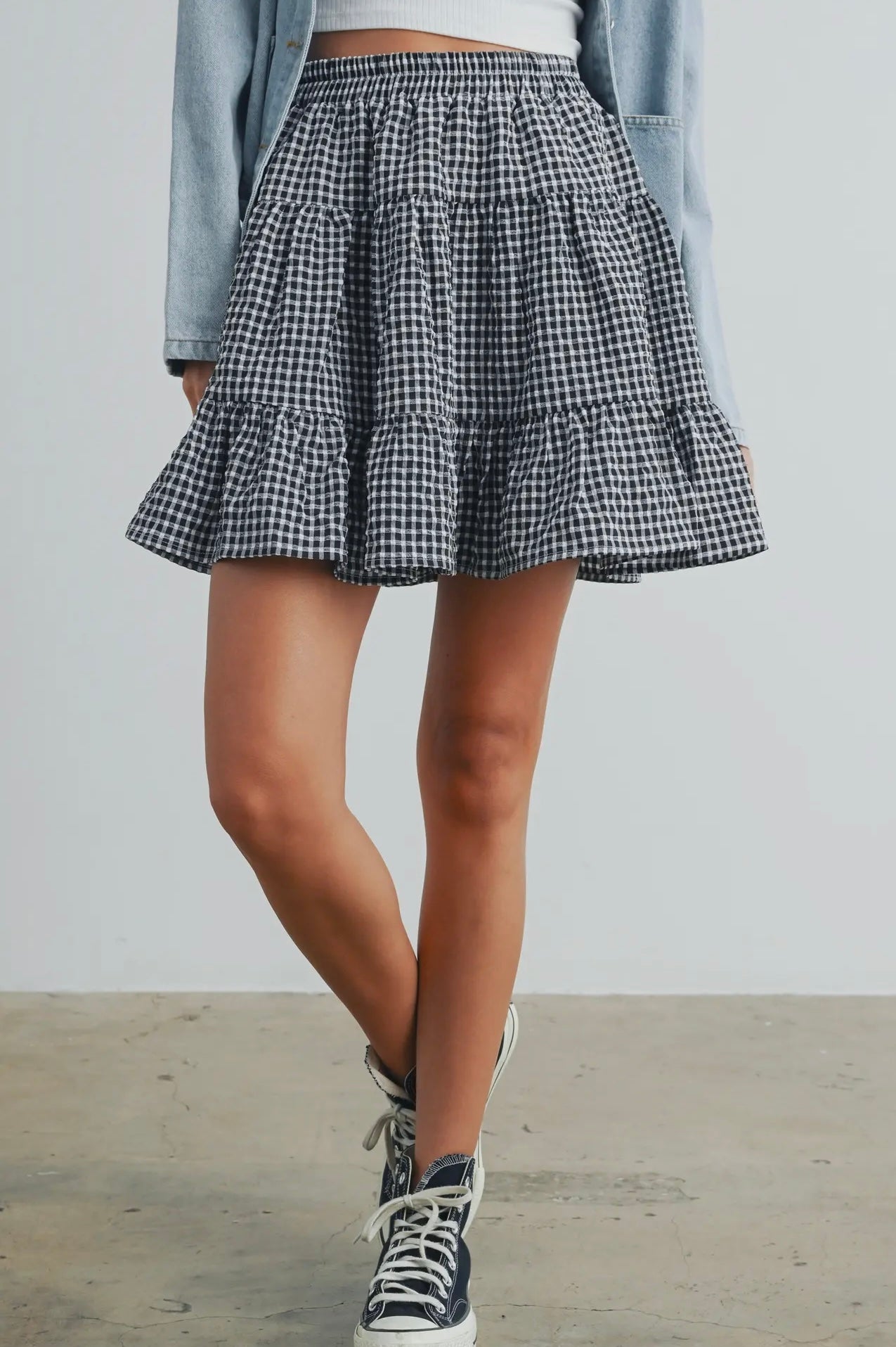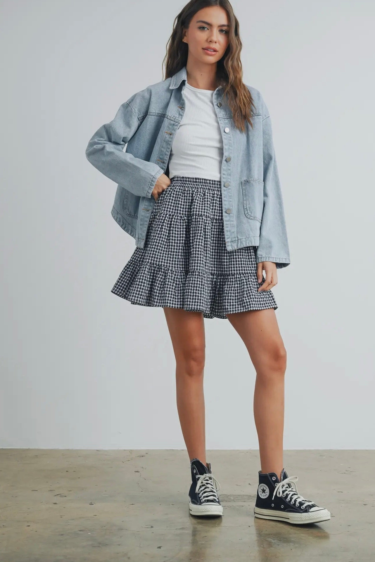 April says: I am 5'3", weigh 125 pounds, wear size 4 jeans, and I wear the small in this skirt. It's the perfect construction and fit; it's not too puffy nor too short. The skirt is longer on me than on this model, as I am shorter than she. It hits about 2-3 inches above my knee.