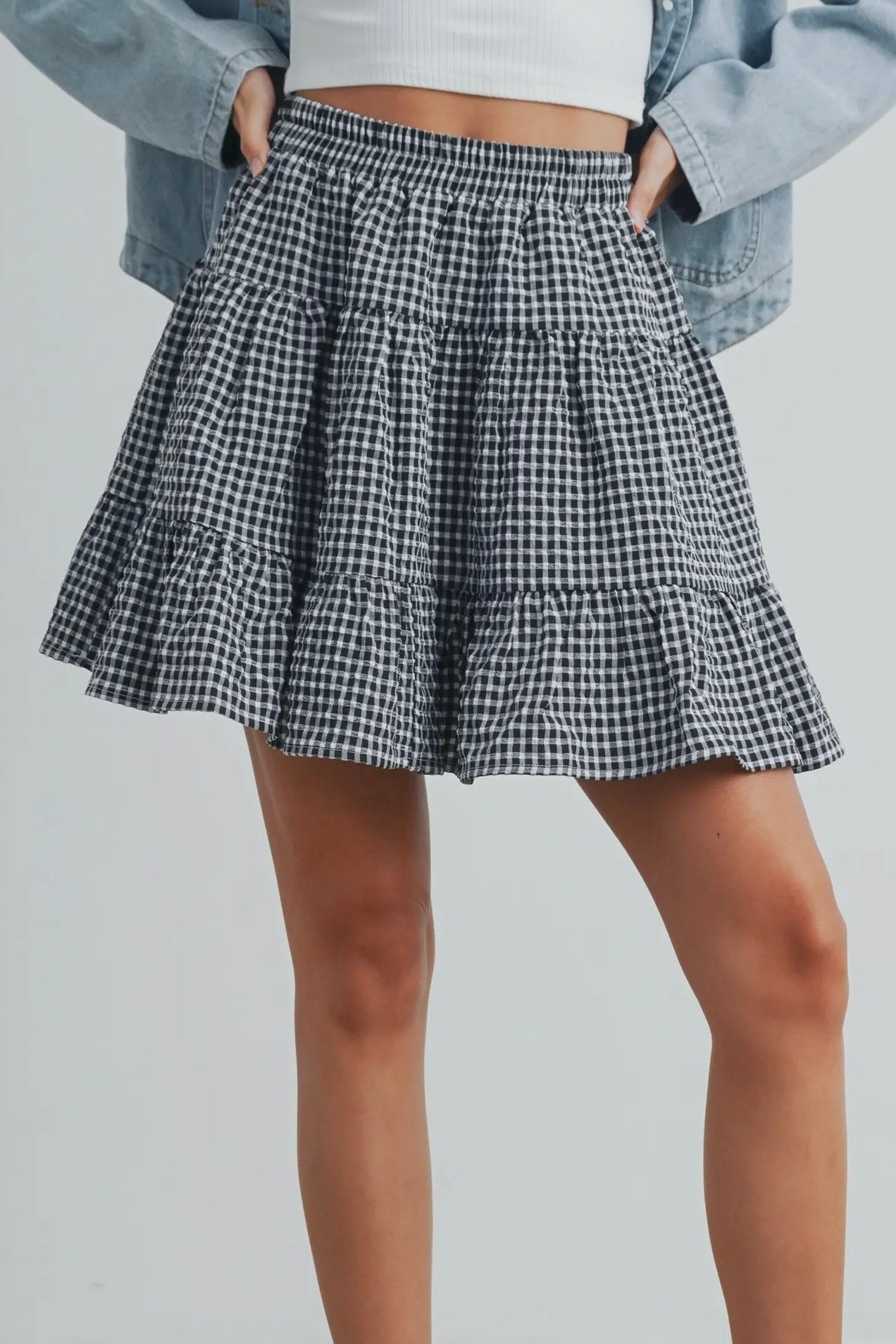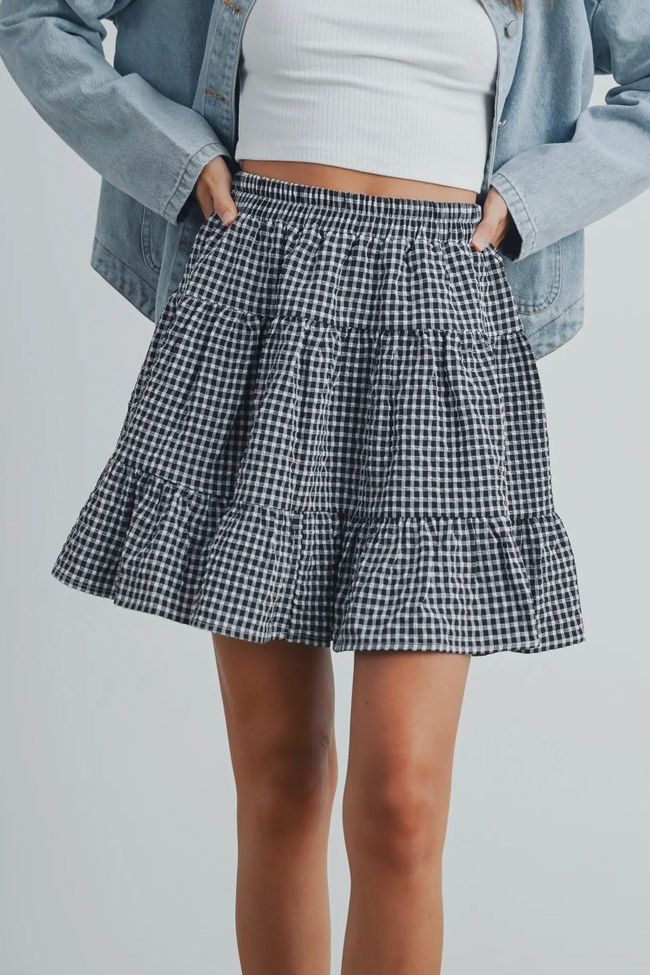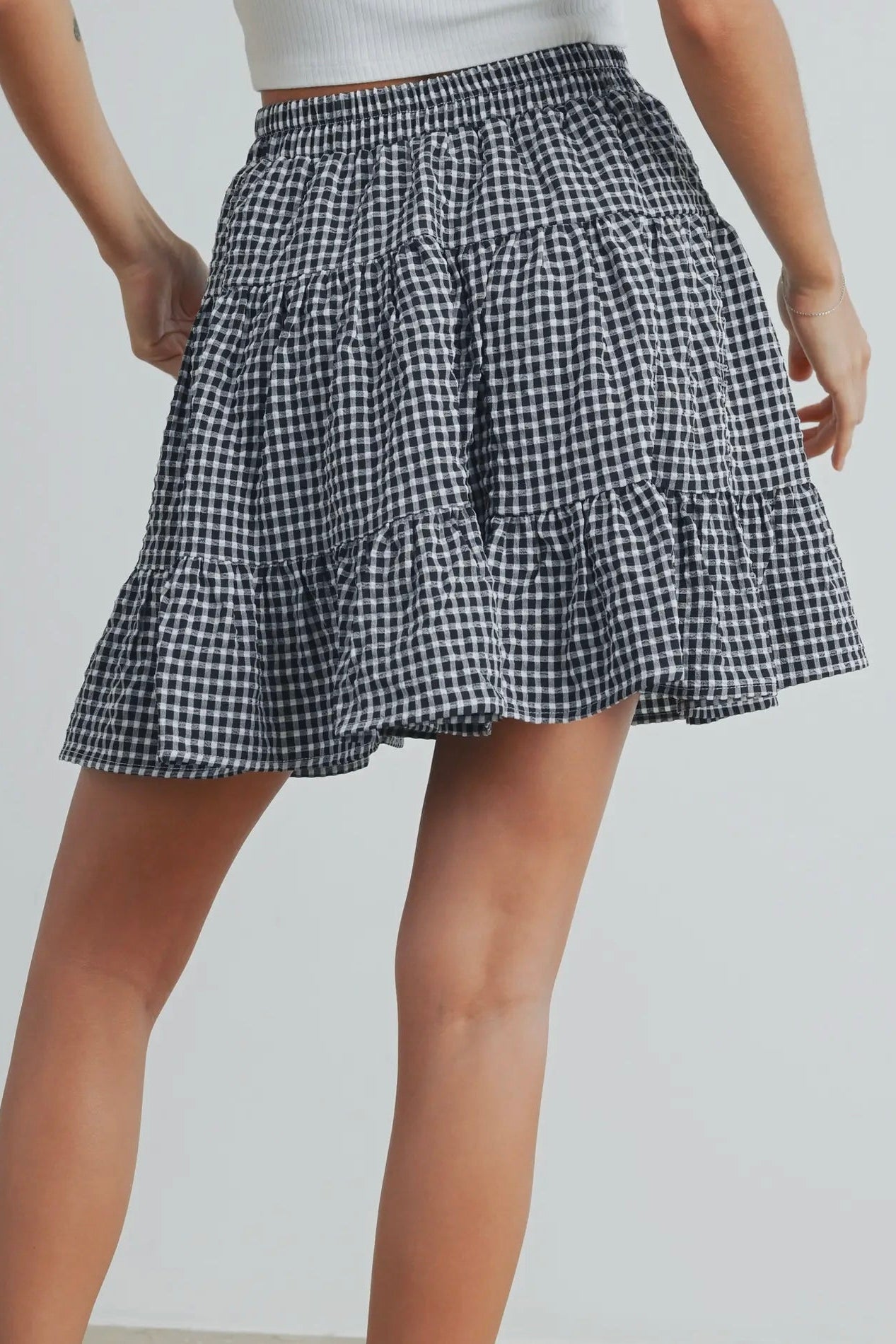 April says: I am 5'3", weigh 125 pounds, wear size 4 jeans, and I wear the small in this skirt. It's the perfect construction and fit; it's not too puffy nor too short. The skirt is longer on me than on this model, as I am shorter than she. It hits about 2-3 inches above my knee.