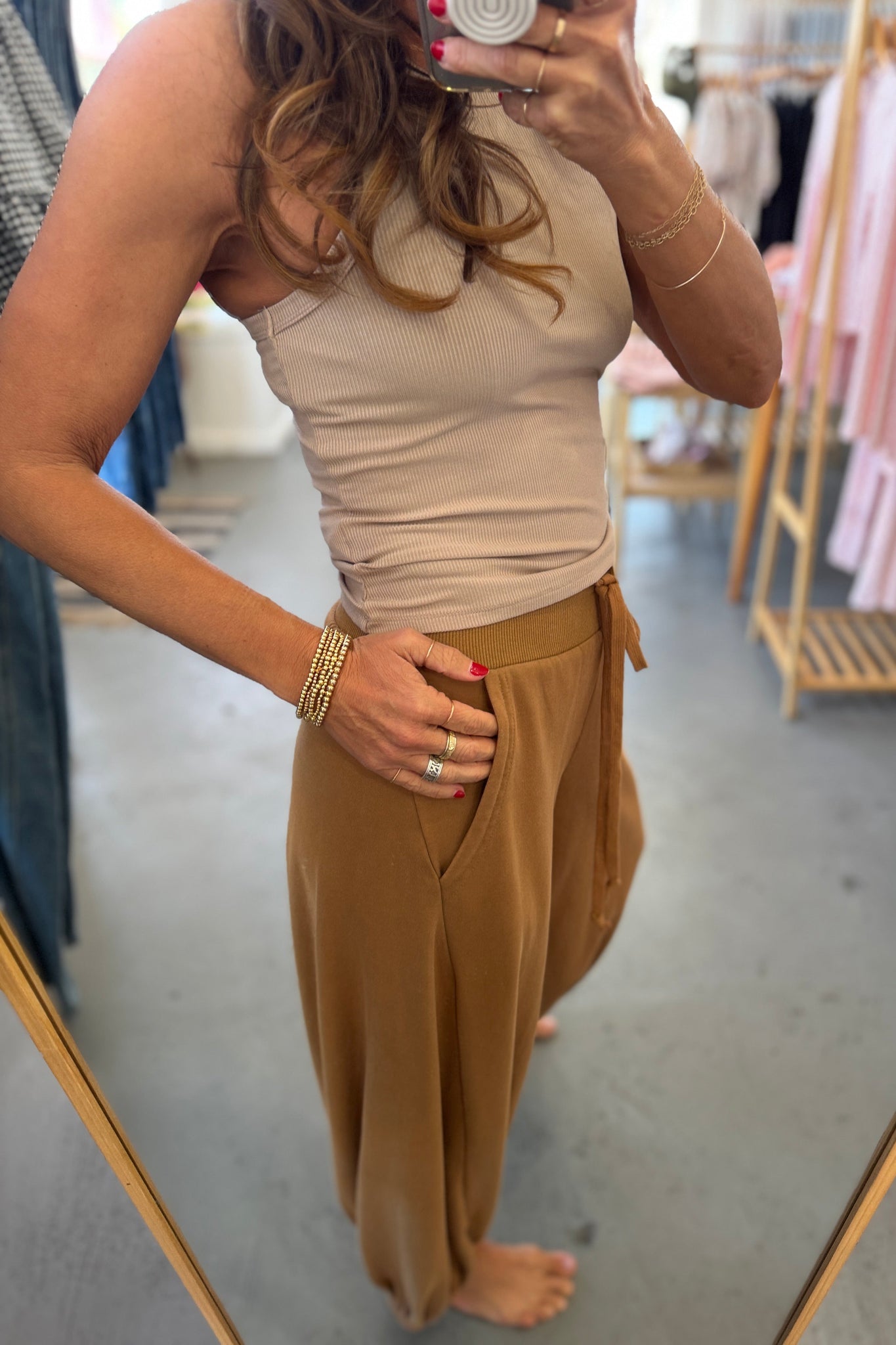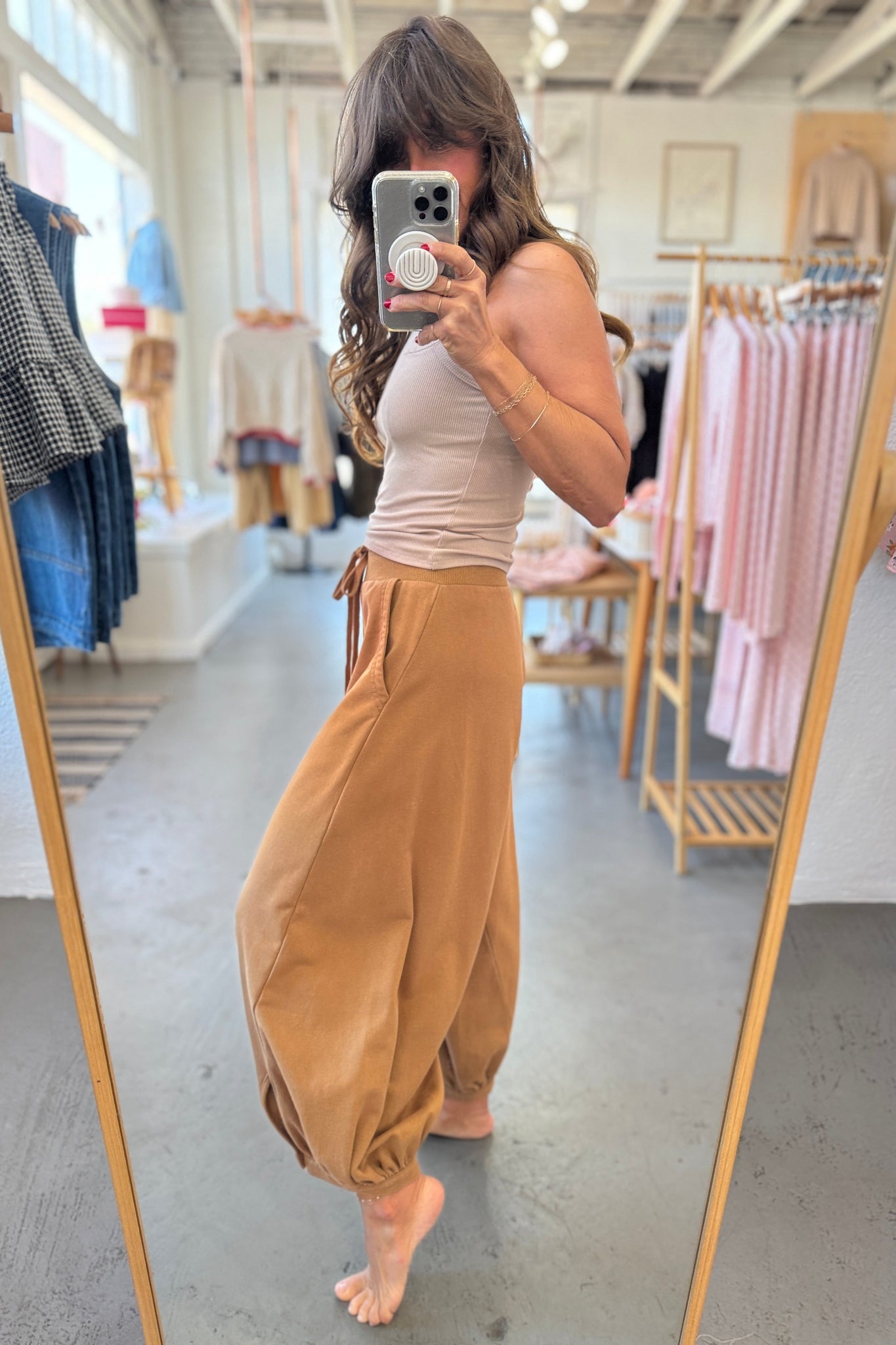 April says: I am 5'3", weigh 125 pounds, wear a 36 B bra, and I wear the small in these pants. These make for great loungewear + atheisure; they have Free People vibes, for sure!