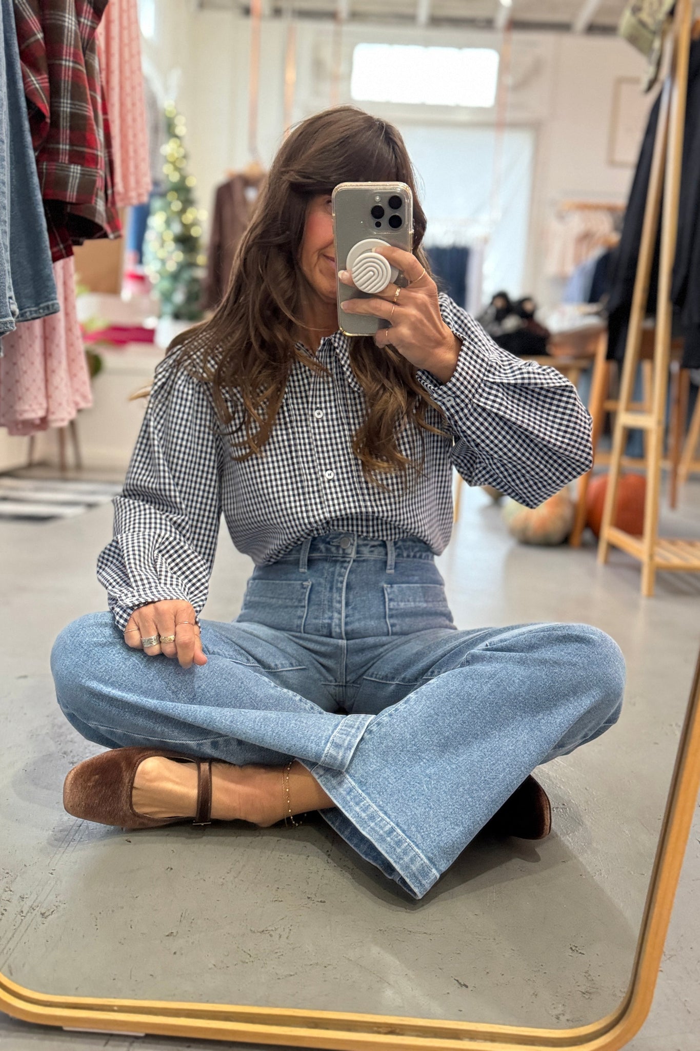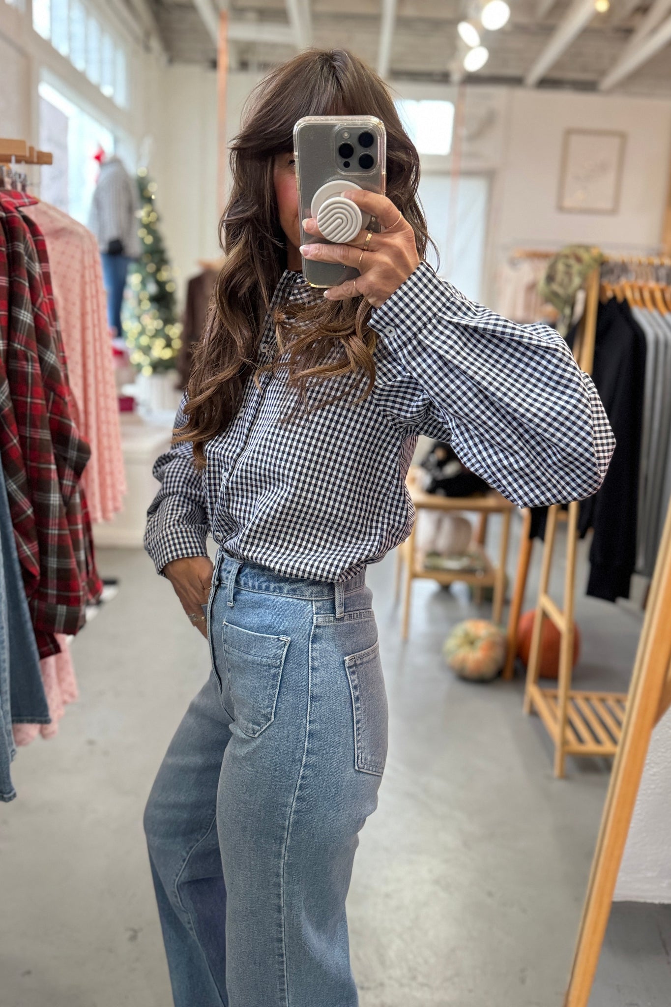 April says: I am 5'3", weigh 125 pounds, wear a 36 B bra, and I wear a small in this top. I am in love with this style: a classic color, a fabulous print and a darling sleeve! The collared gingham top is perfect under a sweater, overalls or a cardigan.