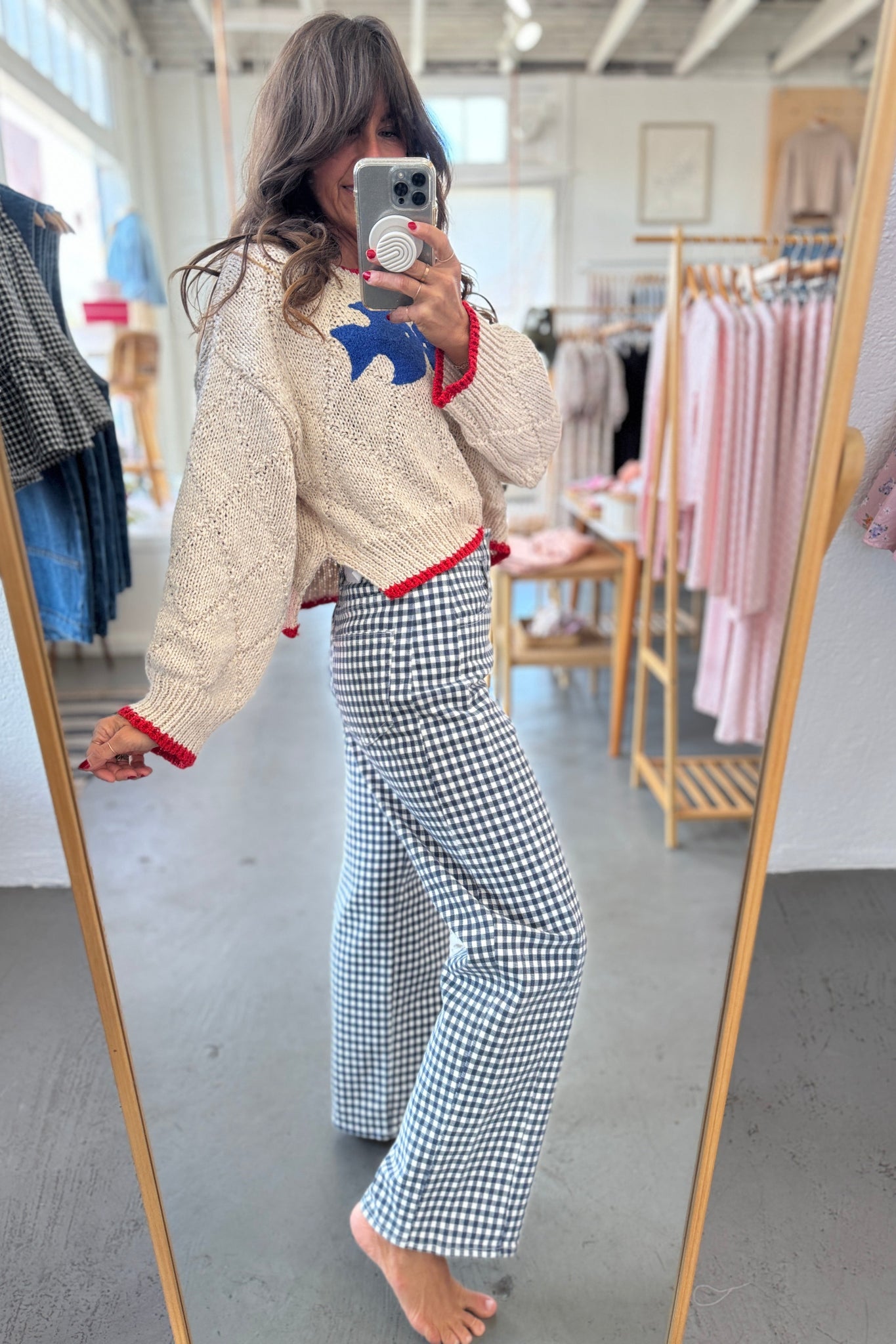Person taking a mirror selfie wearing a white sweater with red trim and checkered pants in a clothing store.