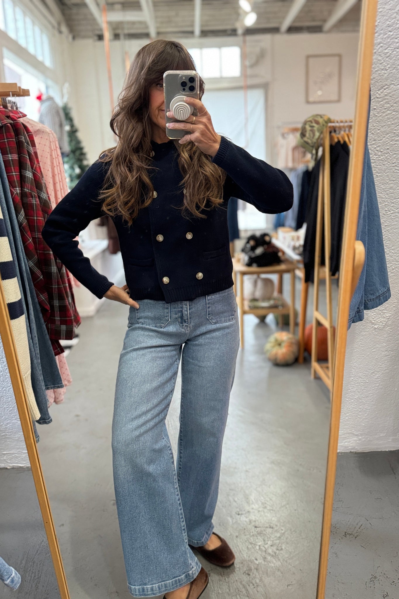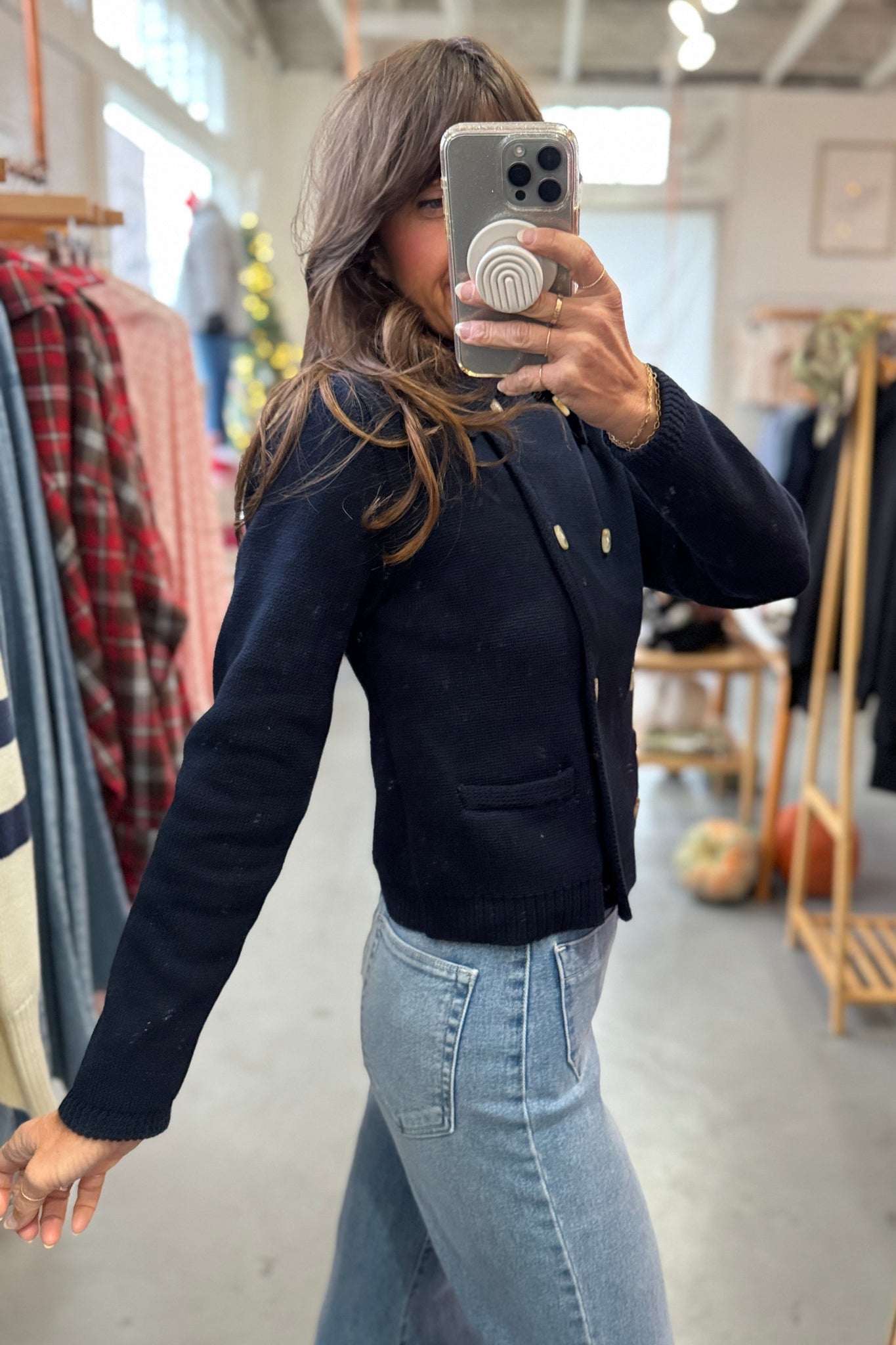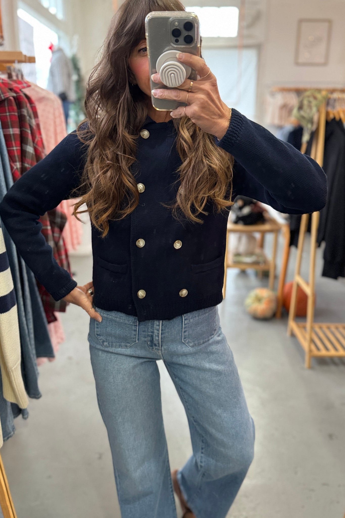 April says: I am 5'3", weigh 125 pounds, wear a 36 B bra, and I wear a small in this sweater. It is a more tailored fit on me; not tight but not a loose fit. This pairs so well with denim and will be adorable with a cute skirt in the spring!