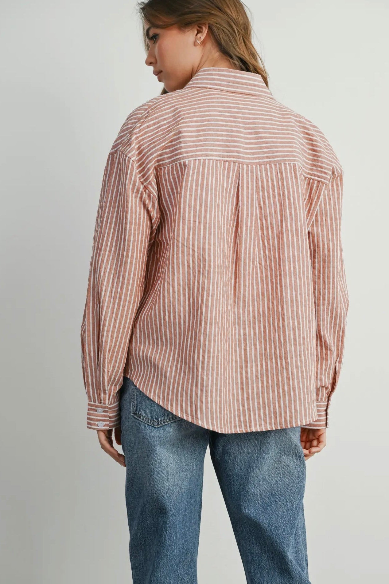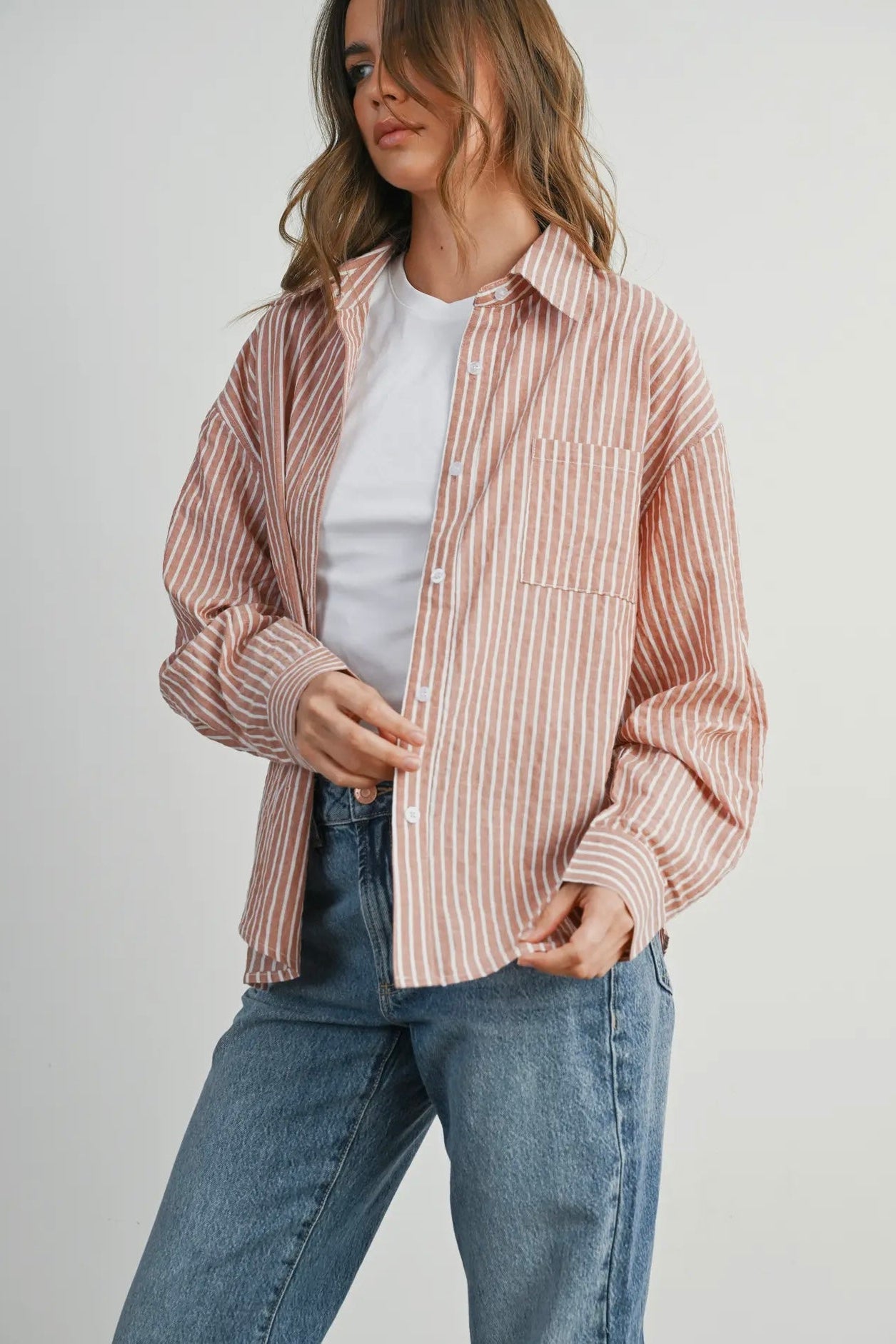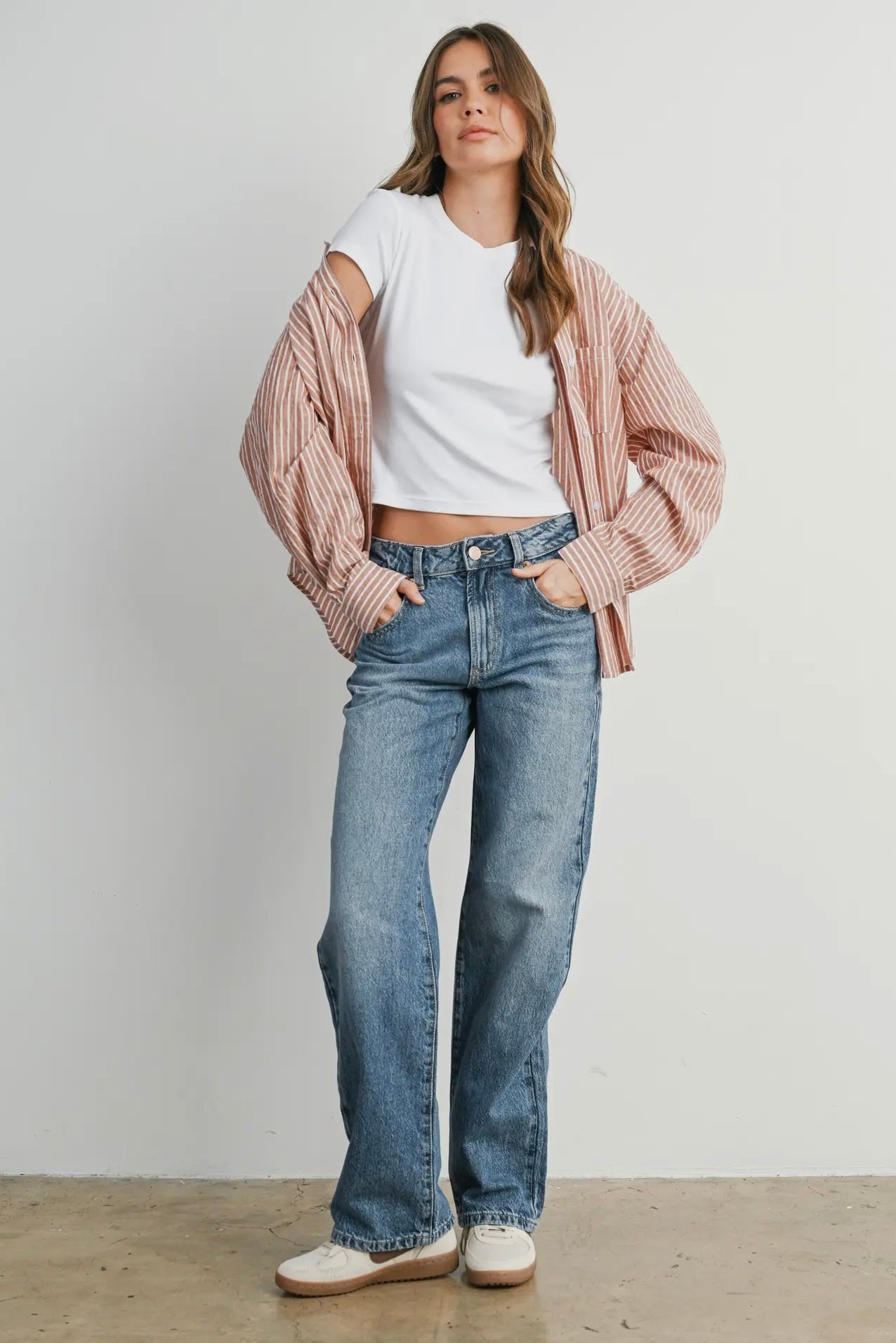 Woman wearing a striped shirt over a white top and jeans on a plain background