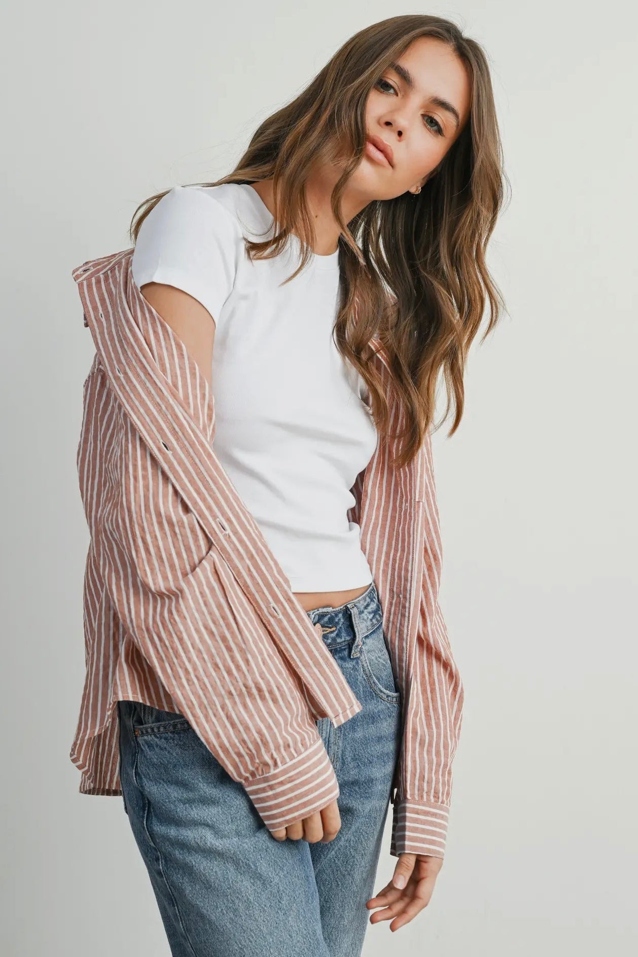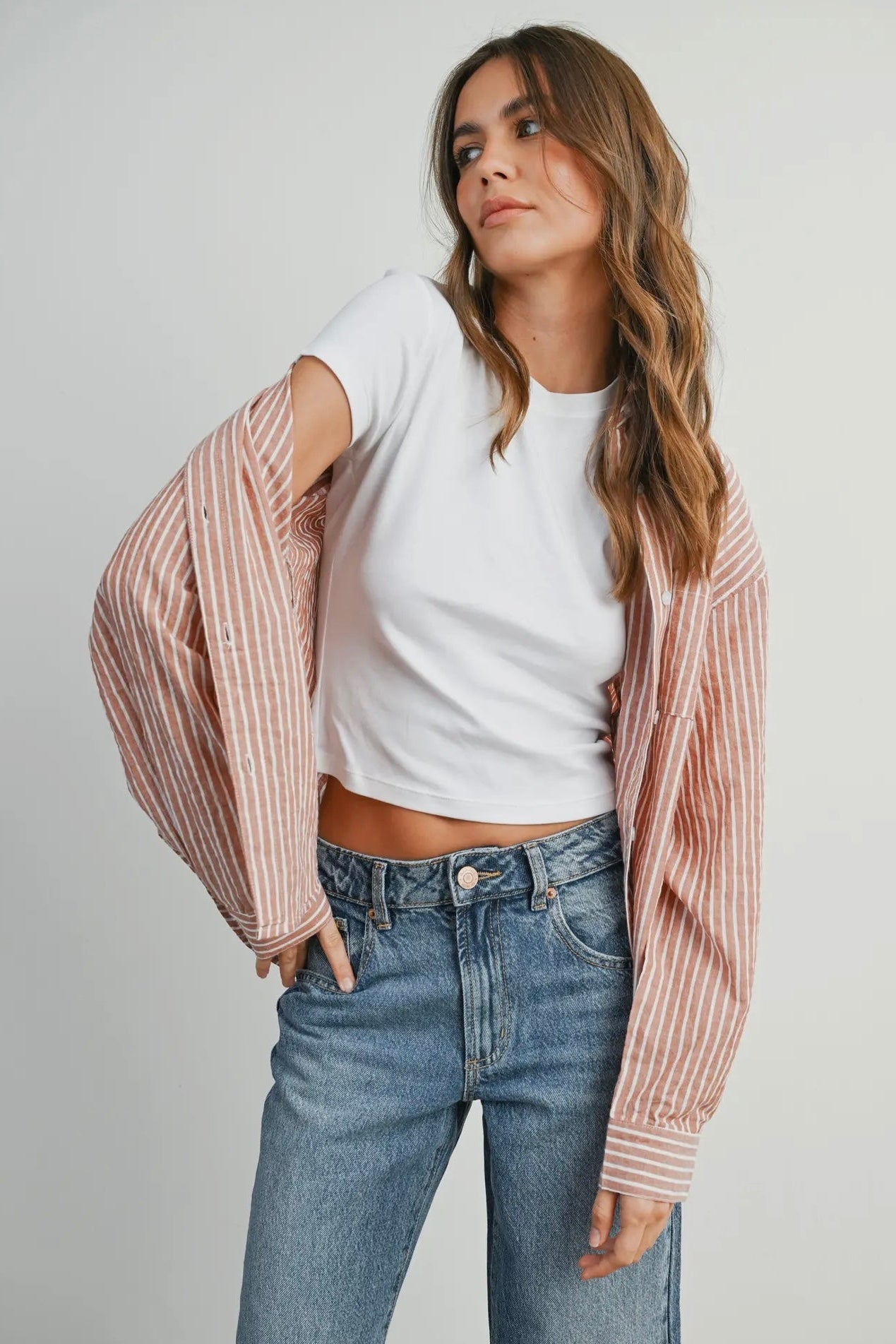 Woman wearing a white t-shirt and blue jeans with a striped pink and white shirt over her shoulders against a plain background.
