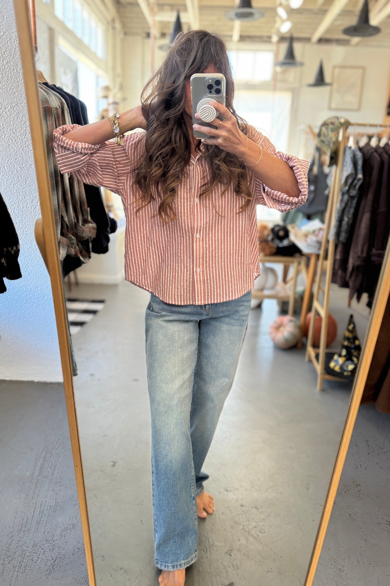 Person taking a mirror selfie wearing a striped shirt and jeans in a clothing store.