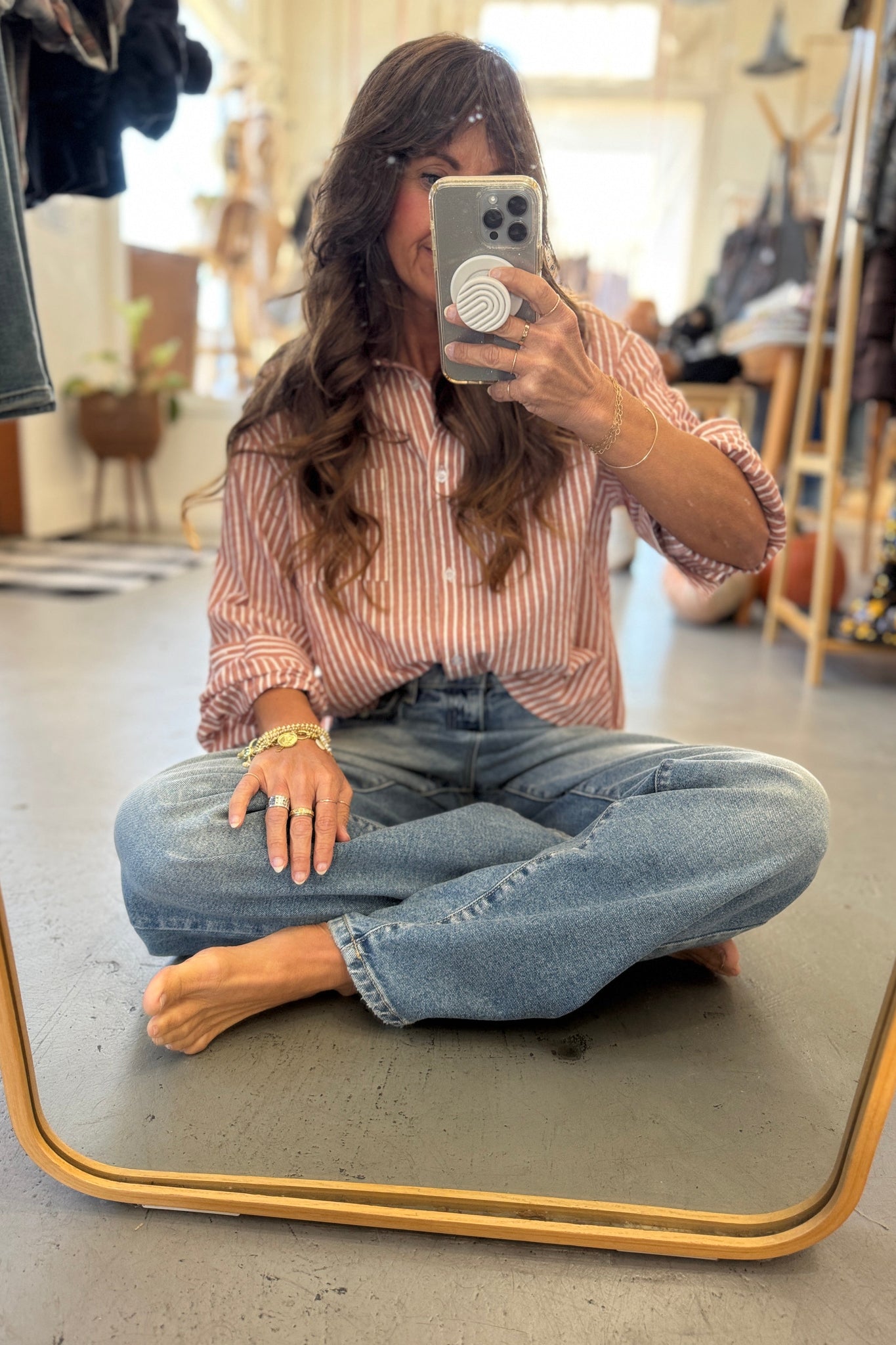 Person sitting on the floor taking a mirror selfie wearing a striped shirt and jeans.