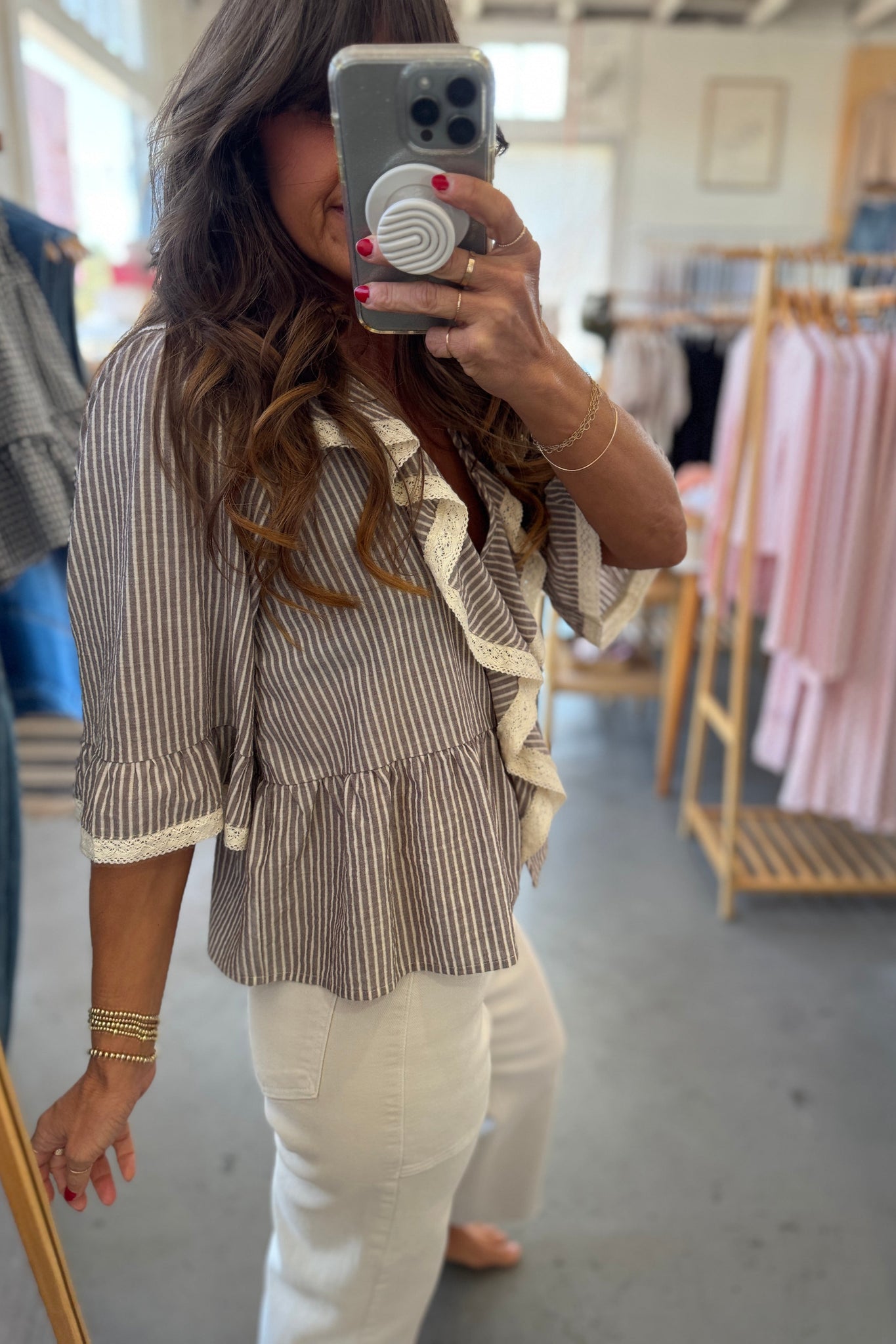 April says: I am 5'3", weigh 125 pounds, wear a 36 B bra, and I wear a small in this top. It's a beautiful top and in a darker color (gray striped) for the fall but lightweight so you can wear it in these warm Texas autumn months!