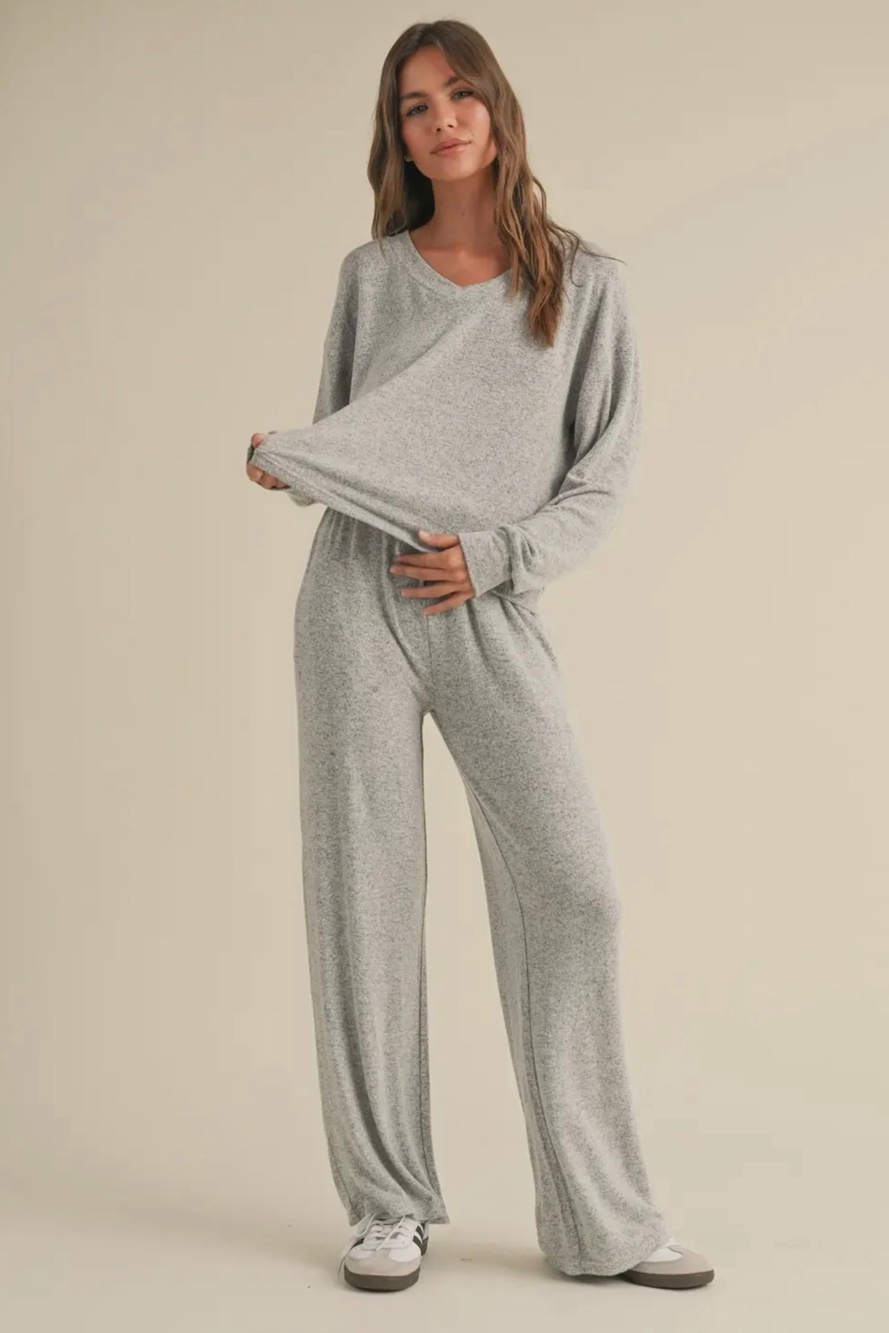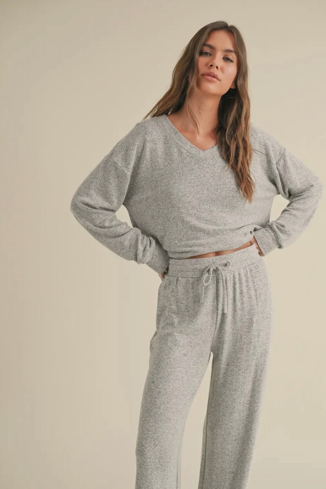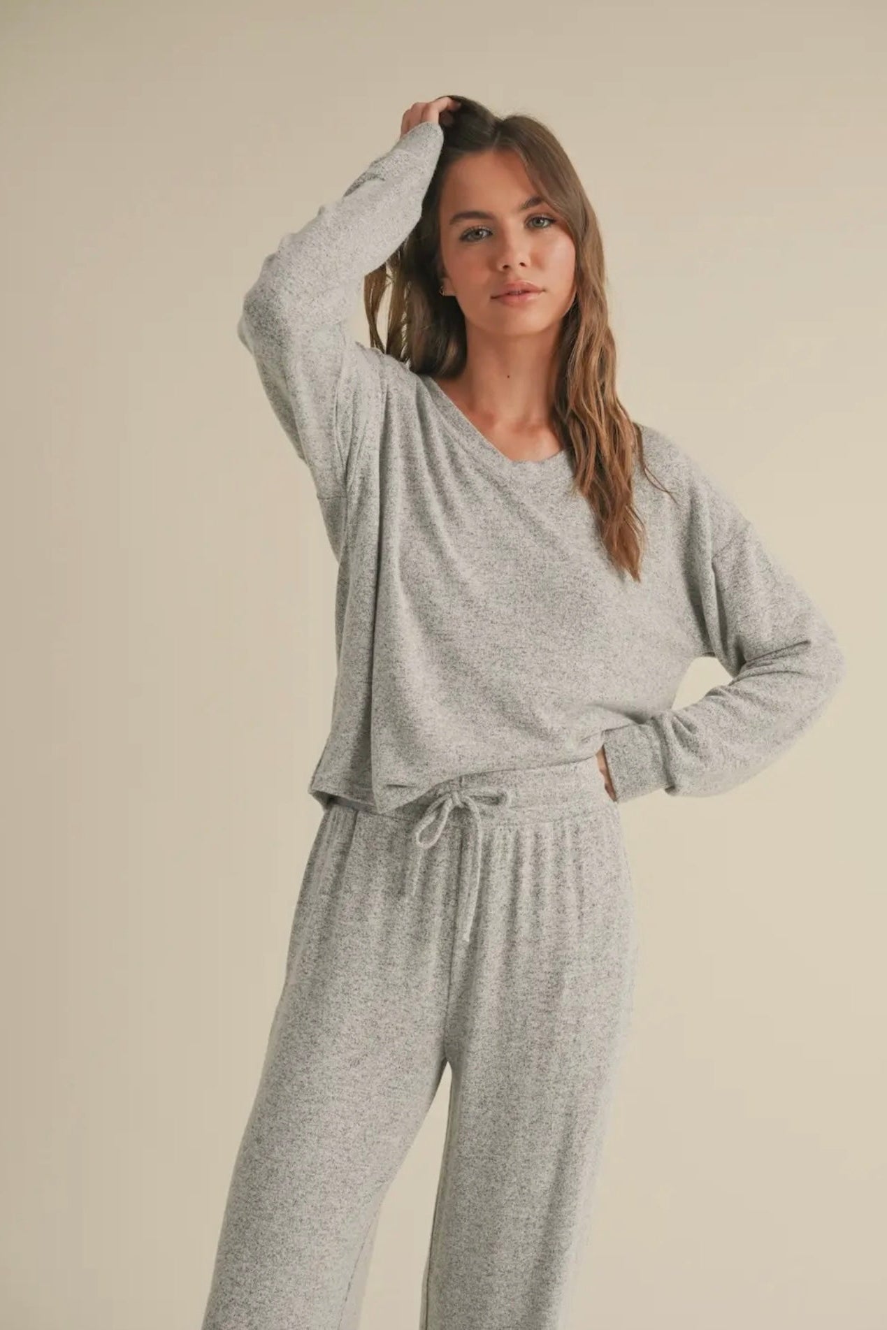 April says: I am 5'3", weigh 125 pounds, wear a 36 B bra and I wear a small in this top. Hacci fabric is some of the softest and coziest material, ever, and makes the perfect lounge set.