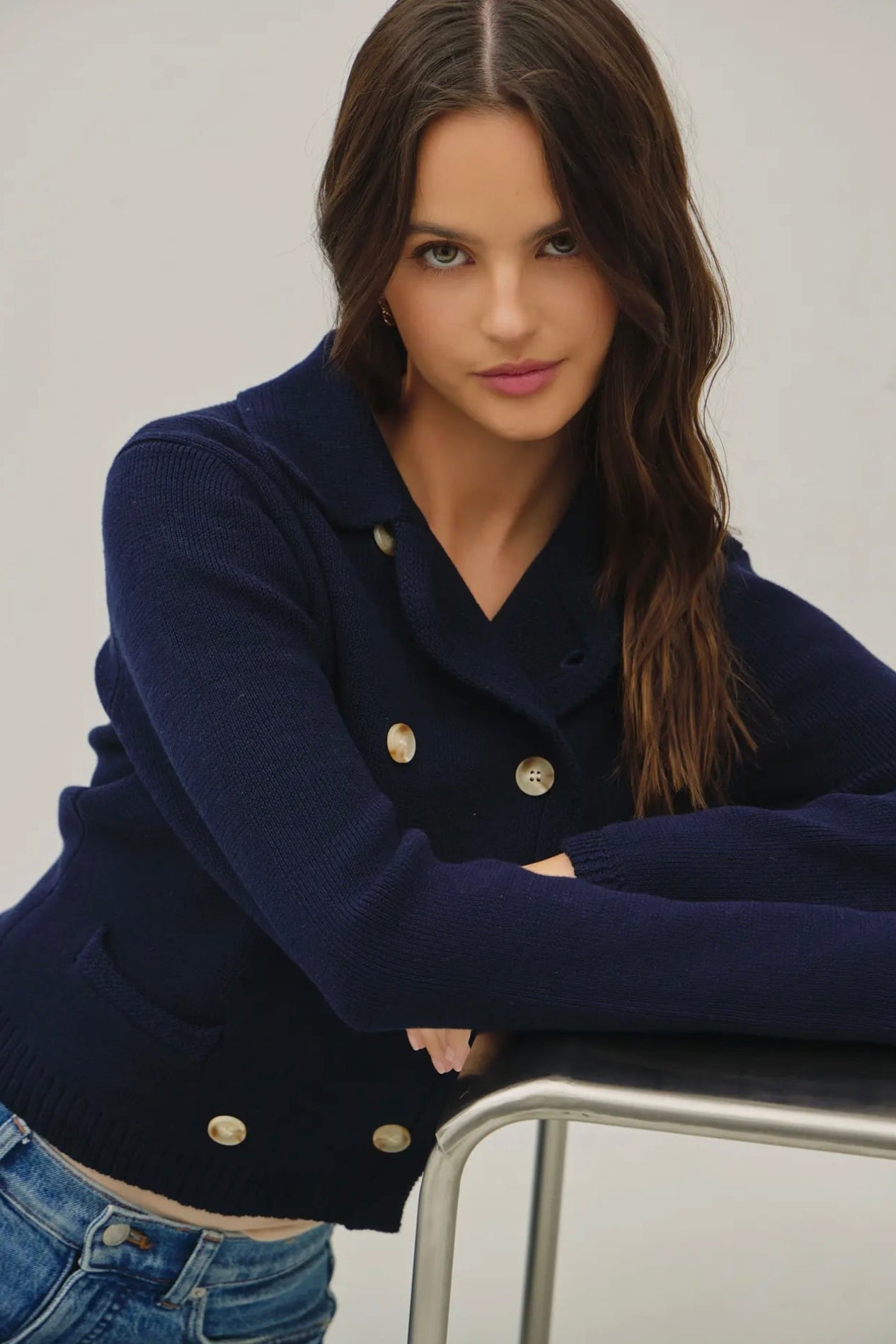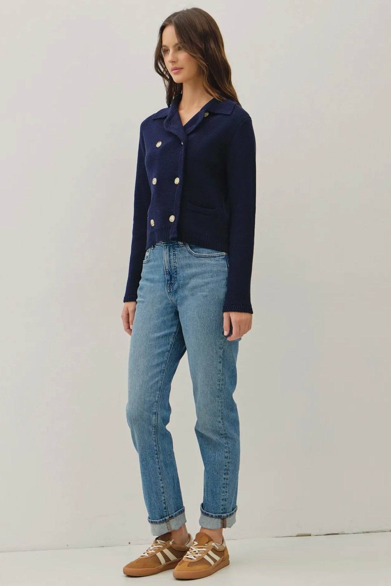 April says: I am 5'3", weigh 125 pounds, wear a 36 B bra, and I wear a small in this sweater. It is a more tailored fit on me; not tight but not a loose fit. This pairs so well with denim and will be adorable with a cute skirt in the spring!