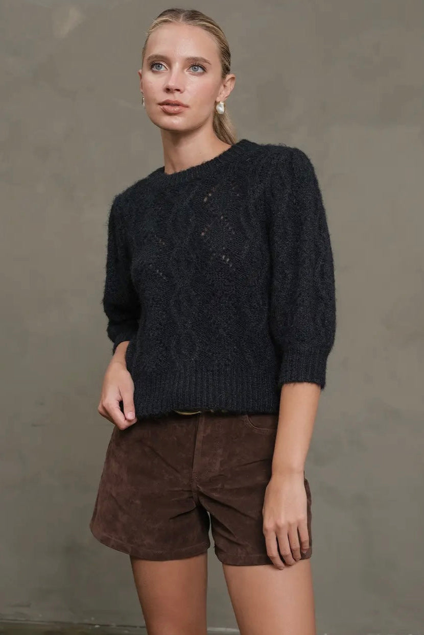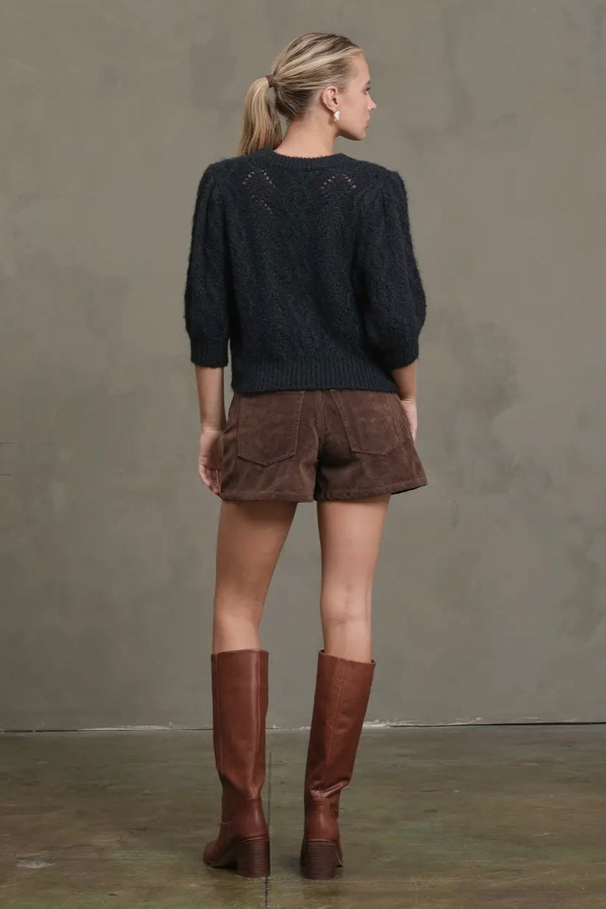 April says: I am 5'3", weigh 125 pounds, wear a 36 B bra, and I wear a small in this sweater. It's a deep navy, truly gorgeous color and goes well with all the brown we are seeing this fall.