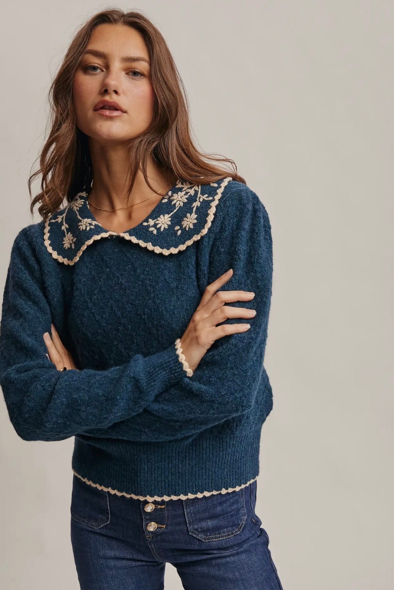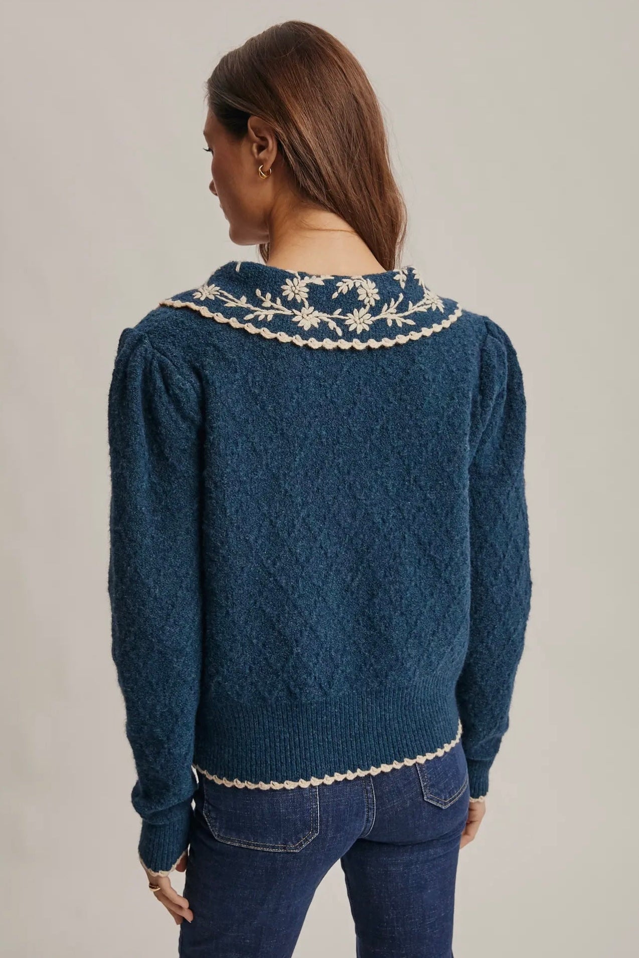 April says: I am 5'3", weigh 125 pounds, wear a 36 B bra, and I wear a small in this sweater. It feels a bit cottage core, vintage-y but very easy to wear with your favorite jeans!