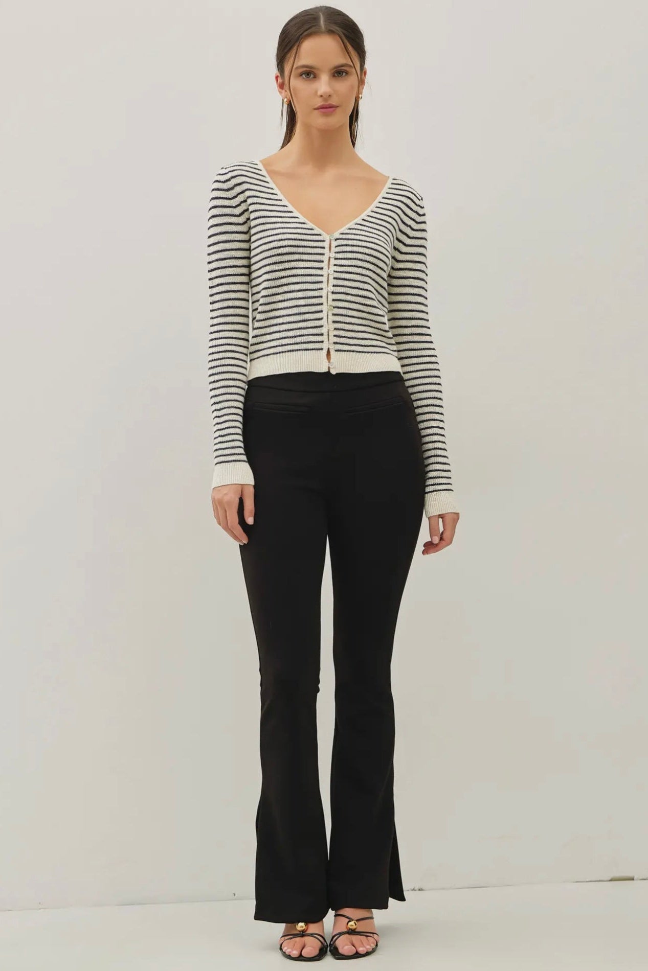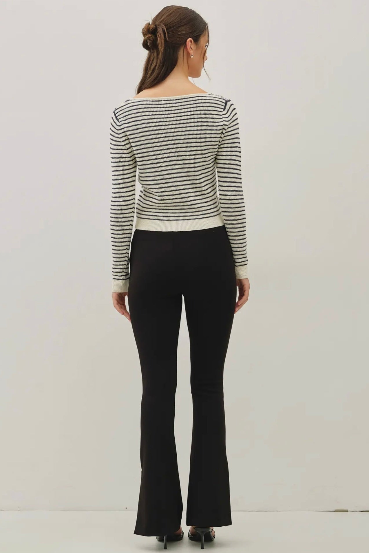 April says: I am 5'3", weigh 125 pounds, wear a 36 B bra, and I wear the small in this top.This knit comes below my belly button and is not cropped on me at all. It's an easy to wear classic style that goes well with your favorite jeans and skirts!