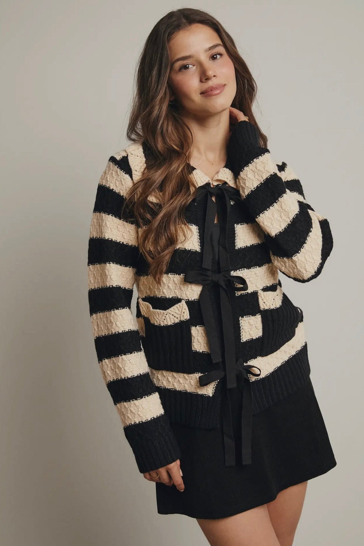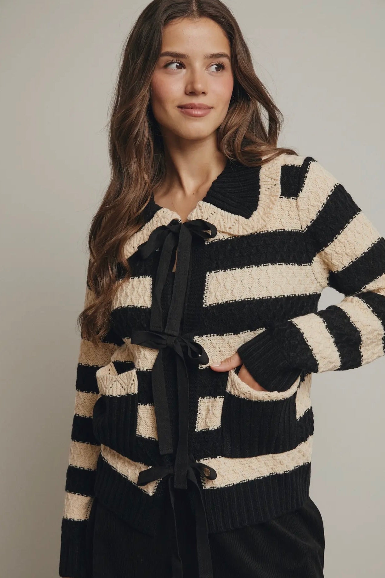 April says: I am 5'3", weigh 125 pounds, wear a 36 B bra, and I wear a small in this sweater. I love a beautiful collar and this one does not disappoint!