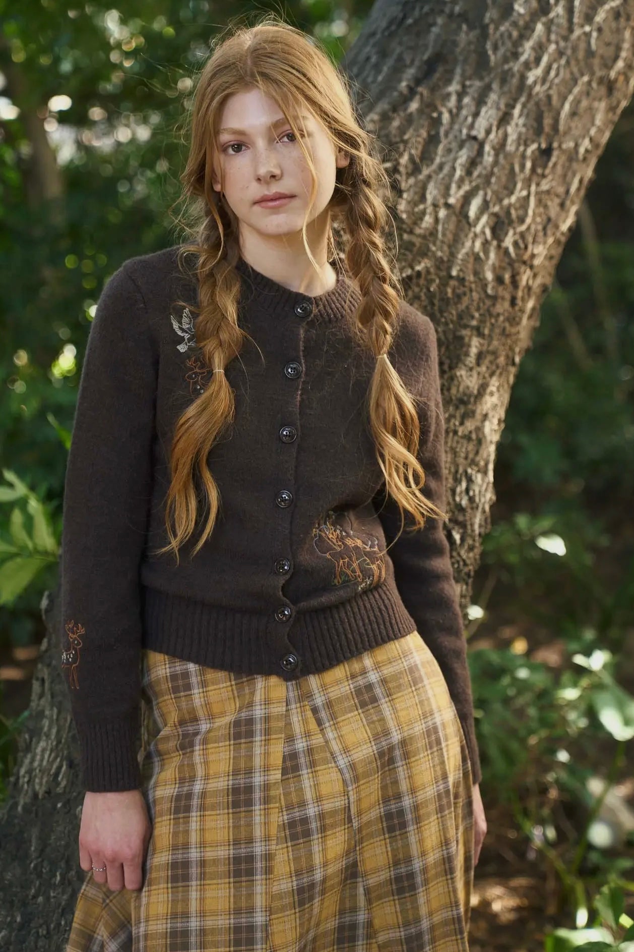 April says: I am 5'3", weigh 125 pounds, wear a 36 B bra, and I wear a small in this cardigan. It can be worn as a top or unbuttoned as a cardi over a dress- it's absolutely precious!