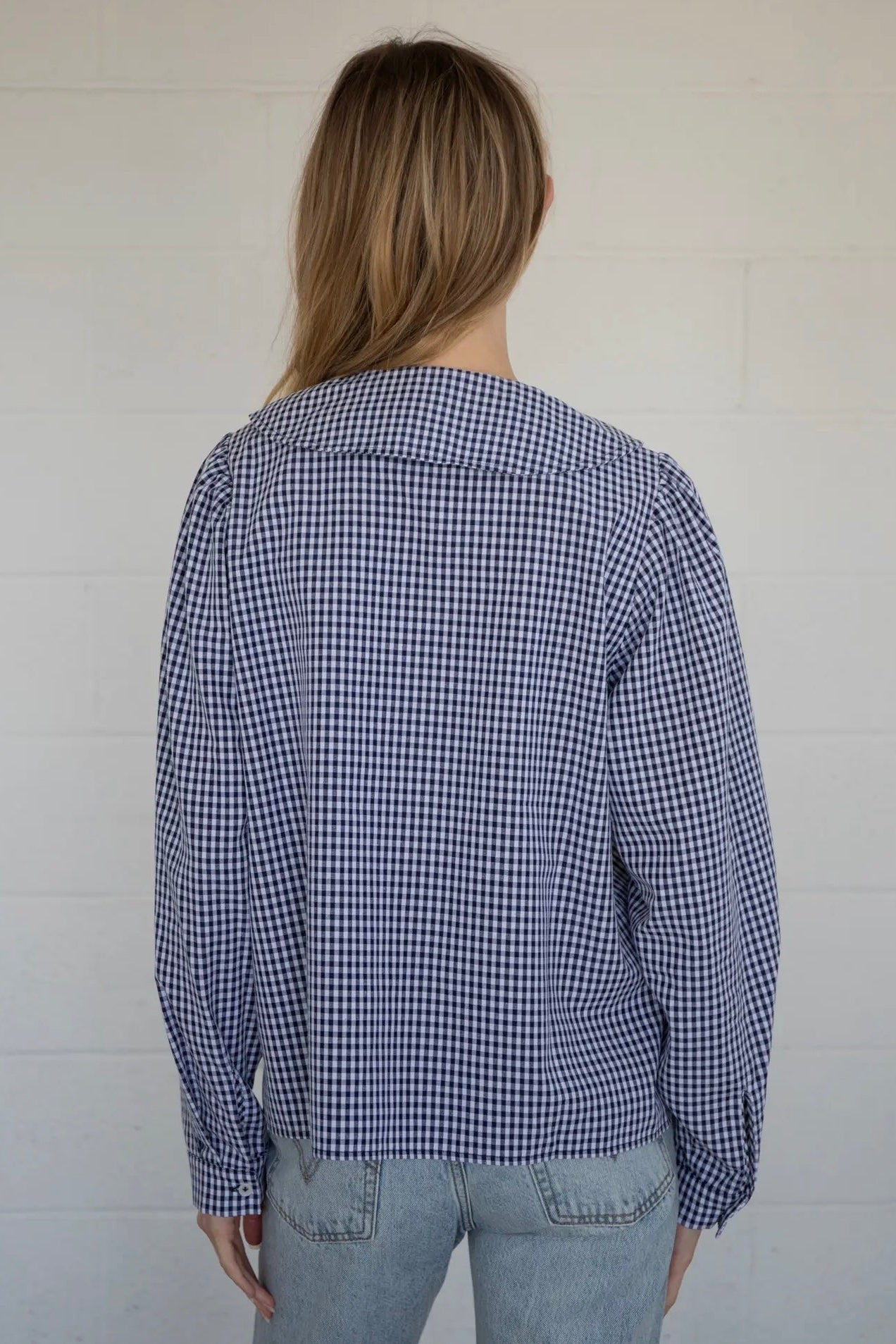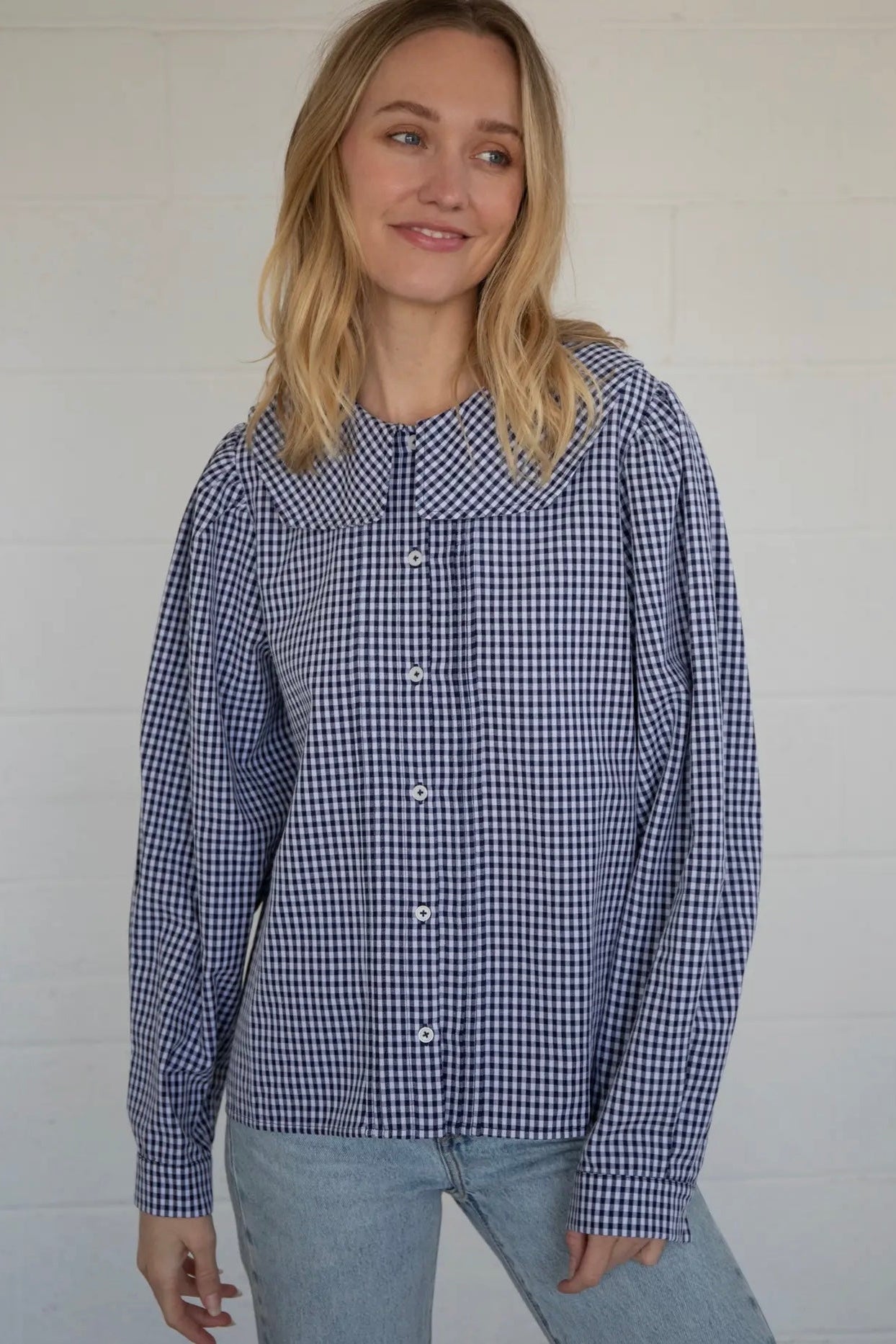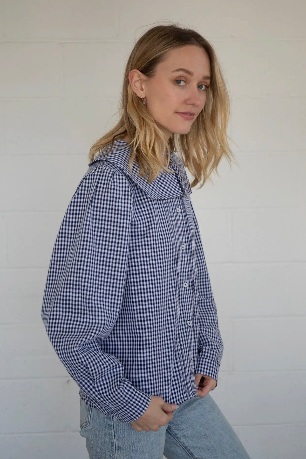 April says: I am 5'3", weigh 125 pounds, wear a 36 B bra, and I wear a small in this top. I am in love with this style: a classic color, a fabulous print and a darling sleeve! The collared gingham top is perfect under a sweater, overalls or a cardigan.