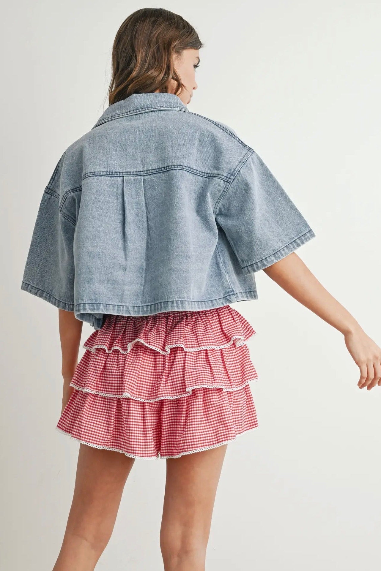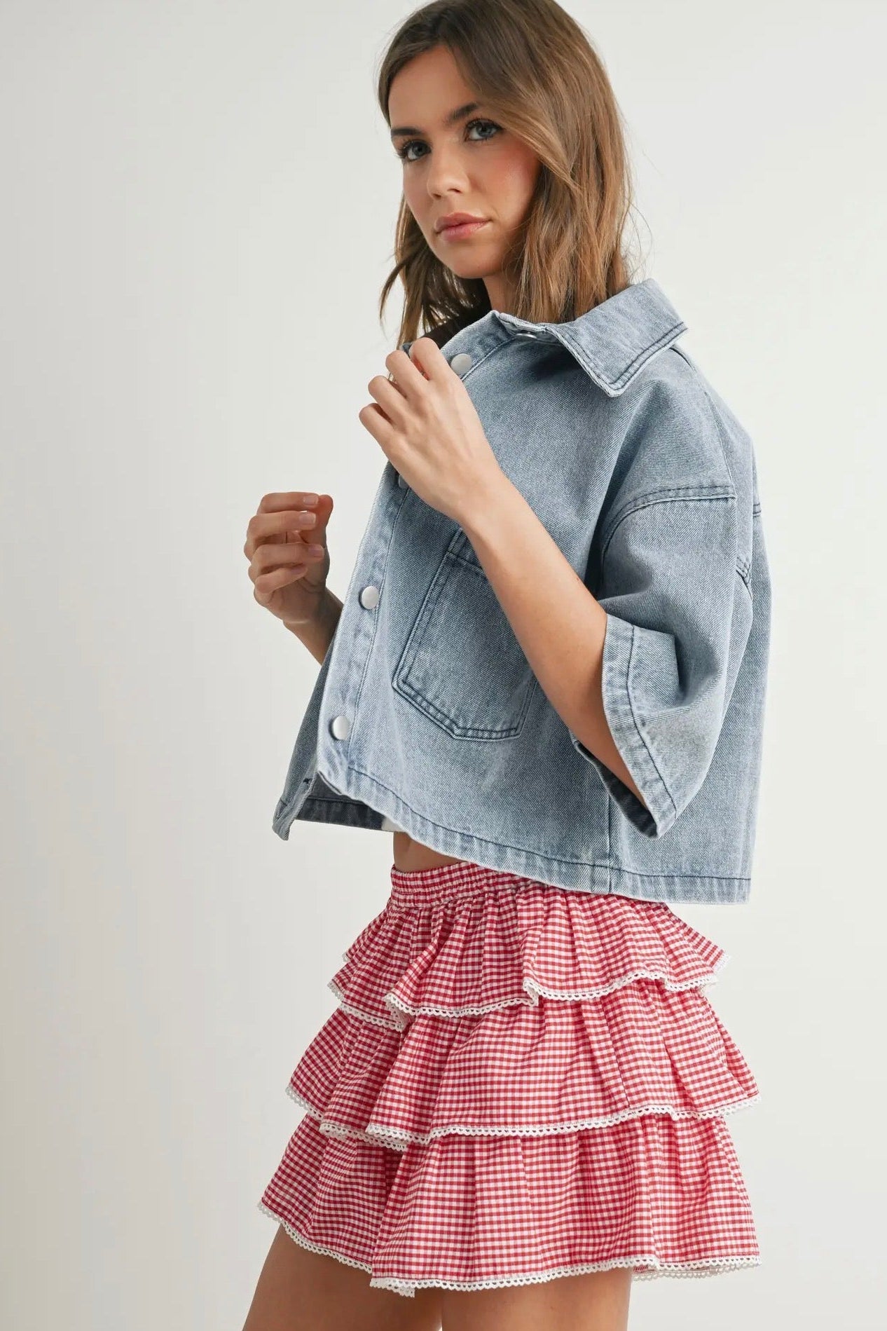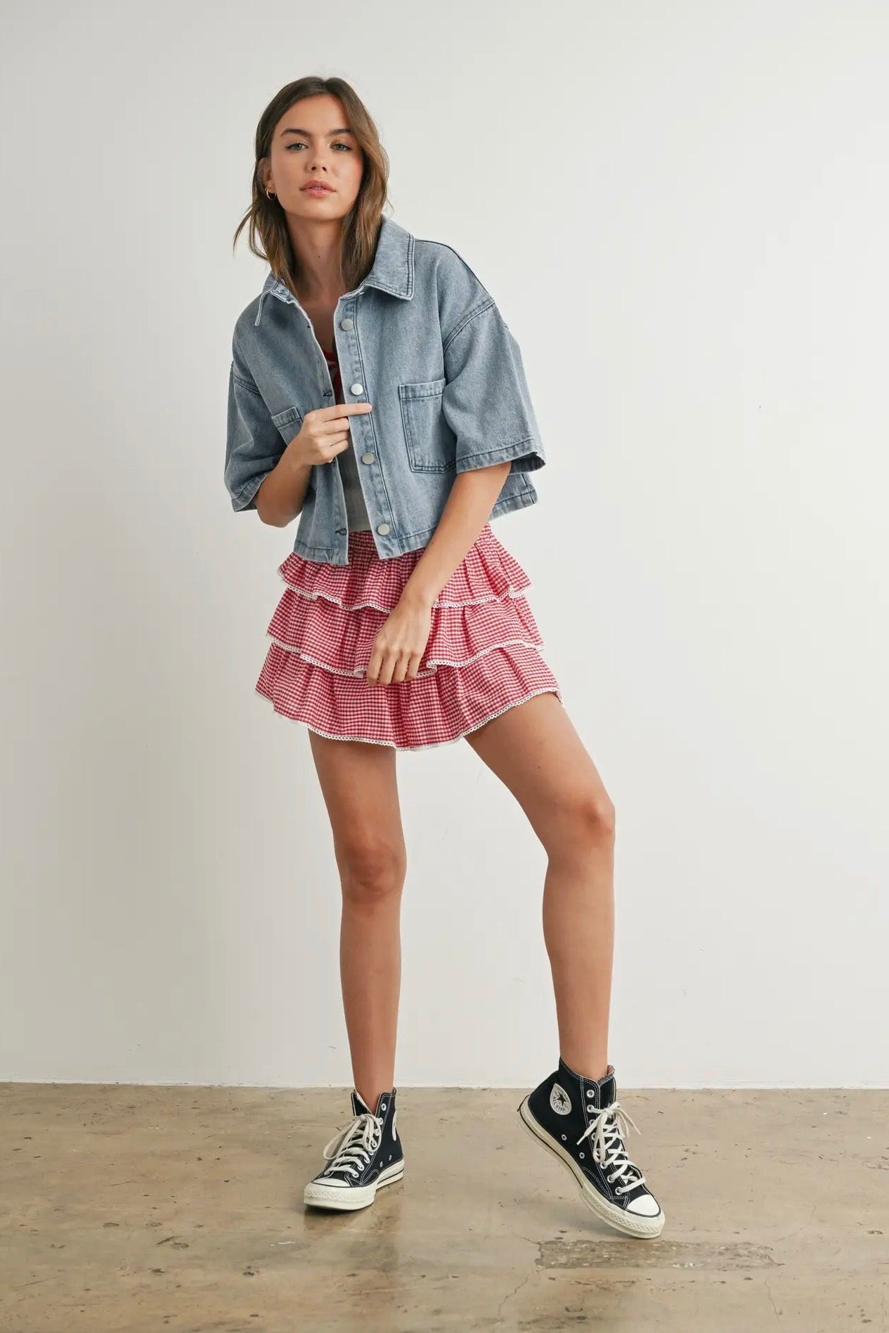 April says: I am 5'3", weigh 125 pounds, wear a 36 B bra, and I wear the small in this top. It's the perfect length to pair with high waisted jeans or a skirt. I also love this one layered over a strappy dress!