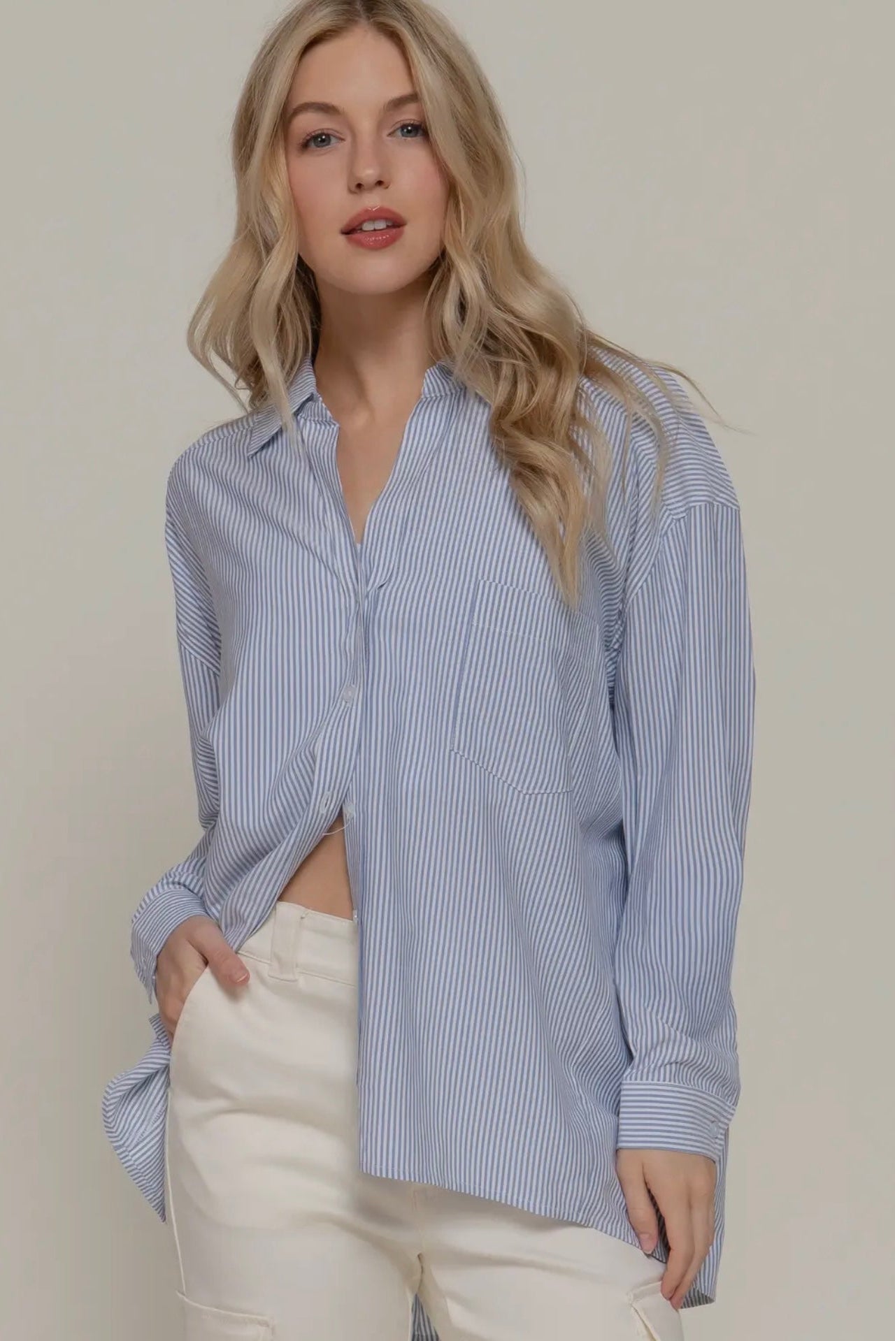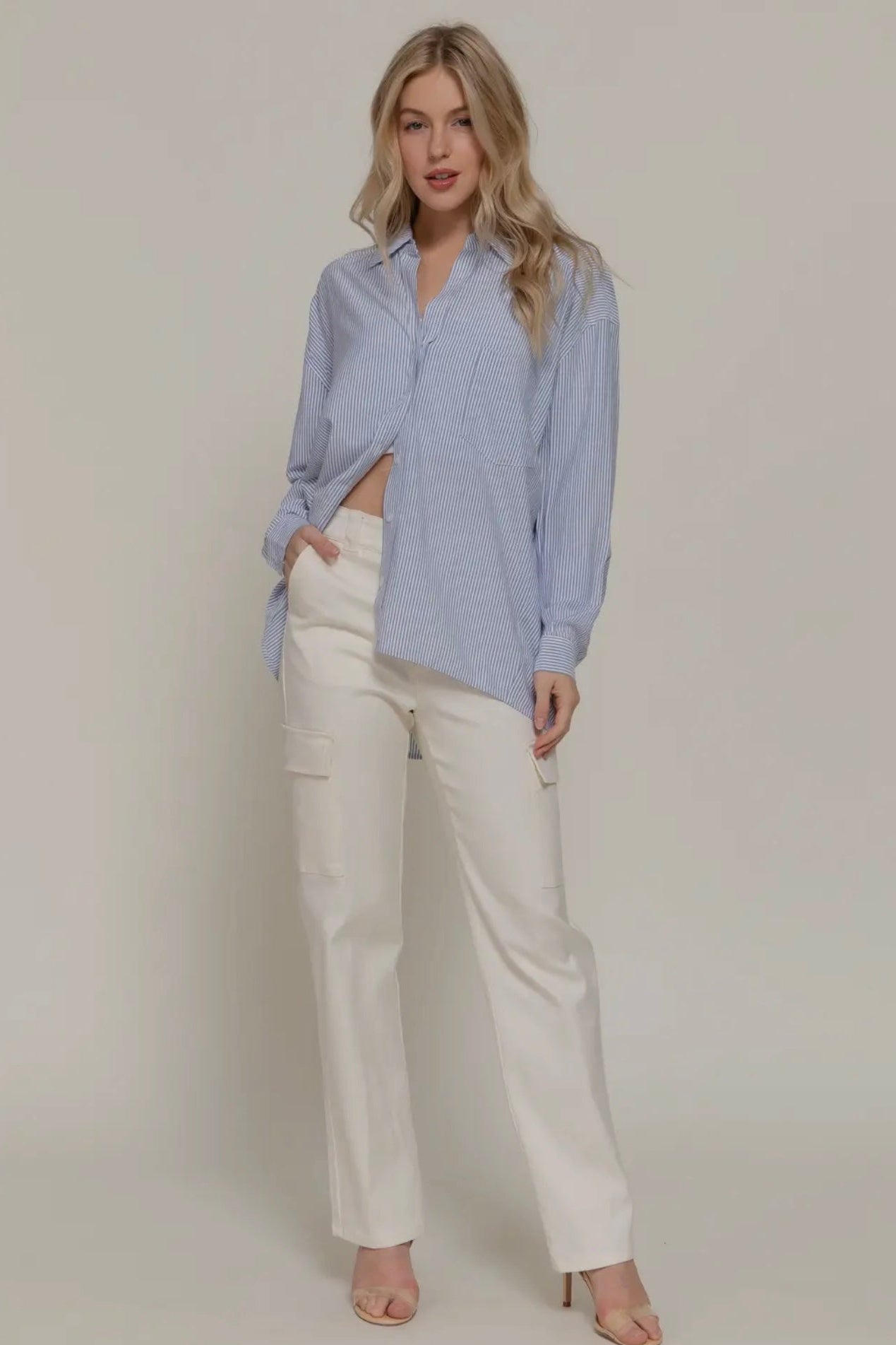 Woman wearing a light blue button-up shirt and white pants on a plain background