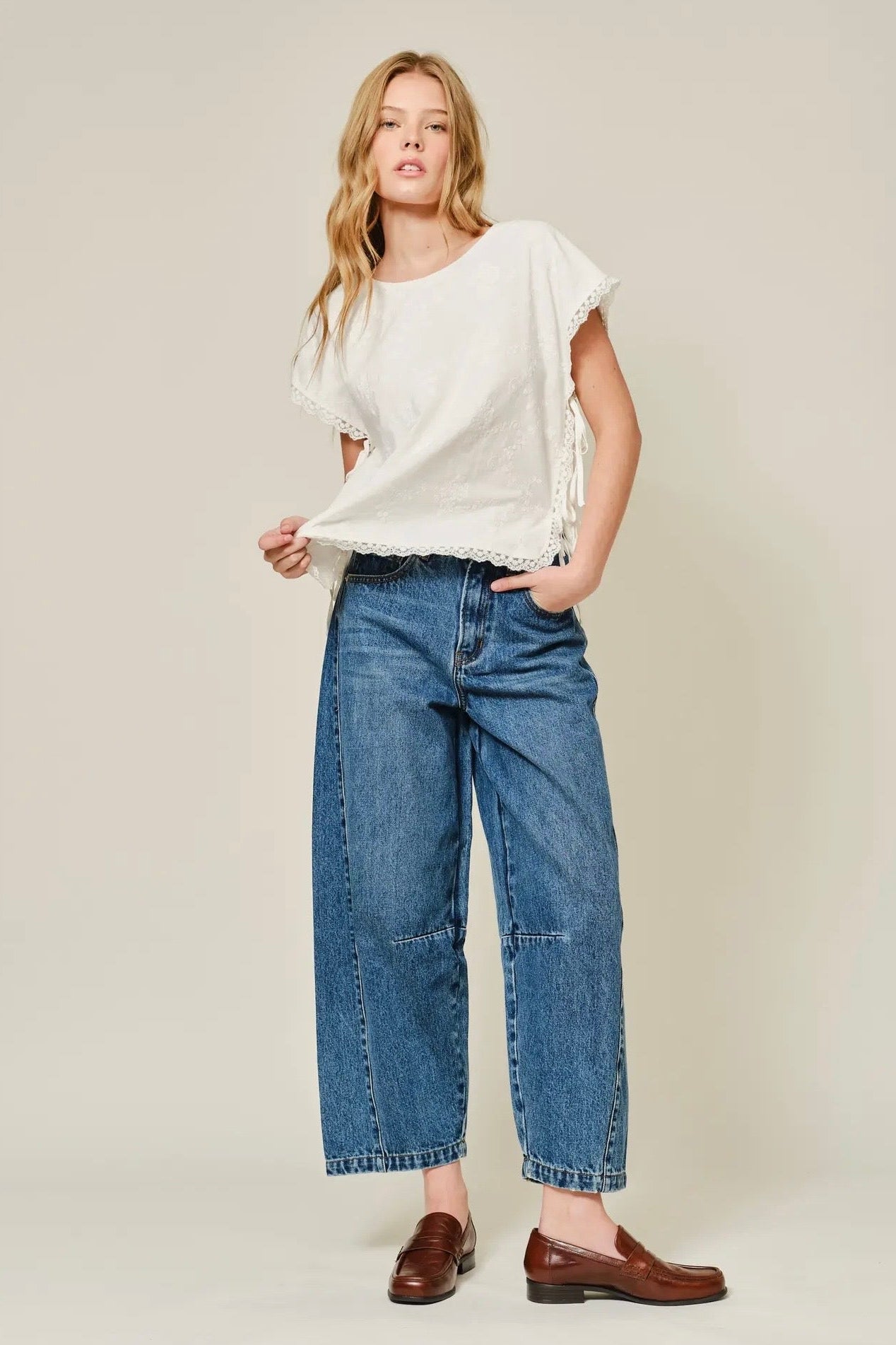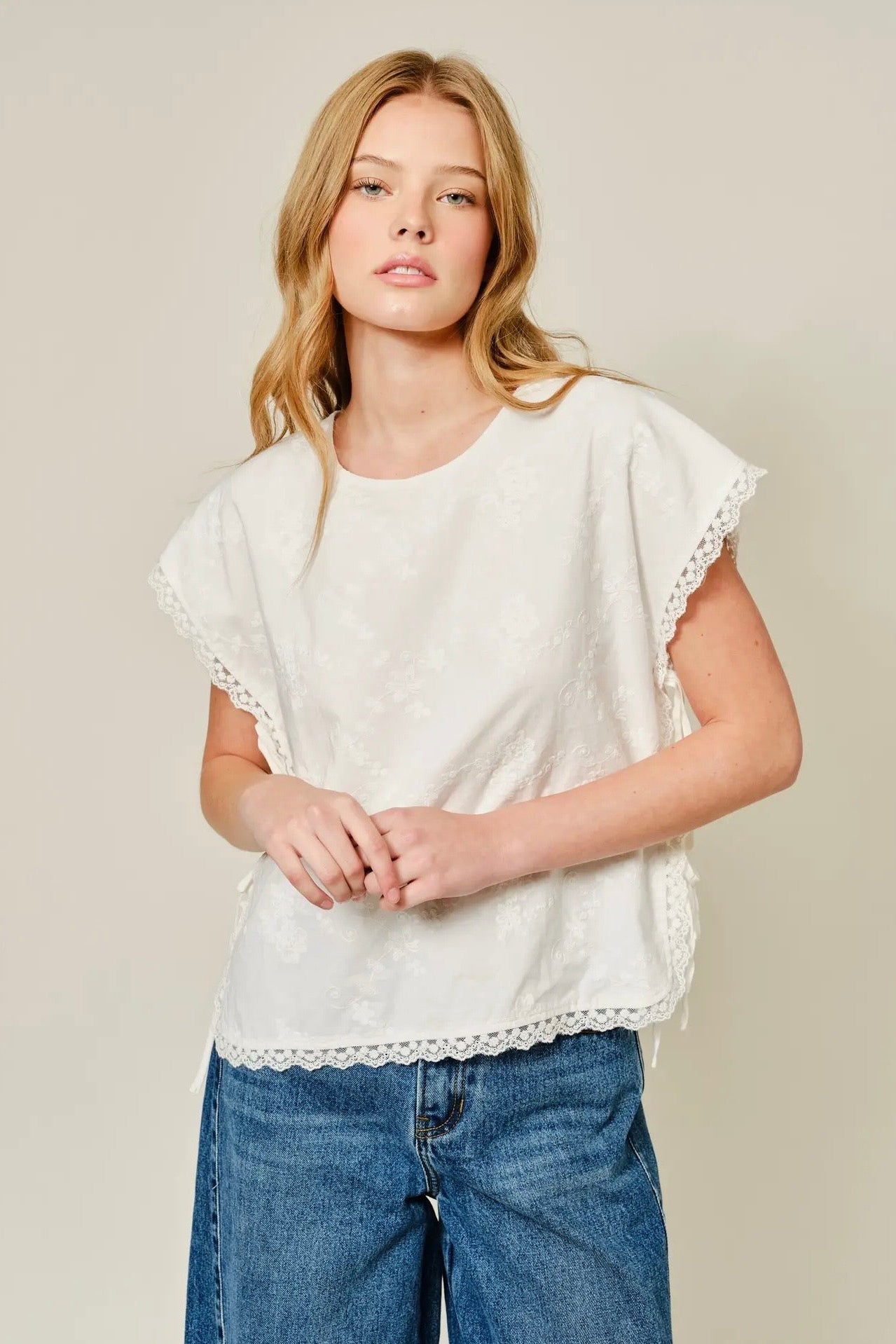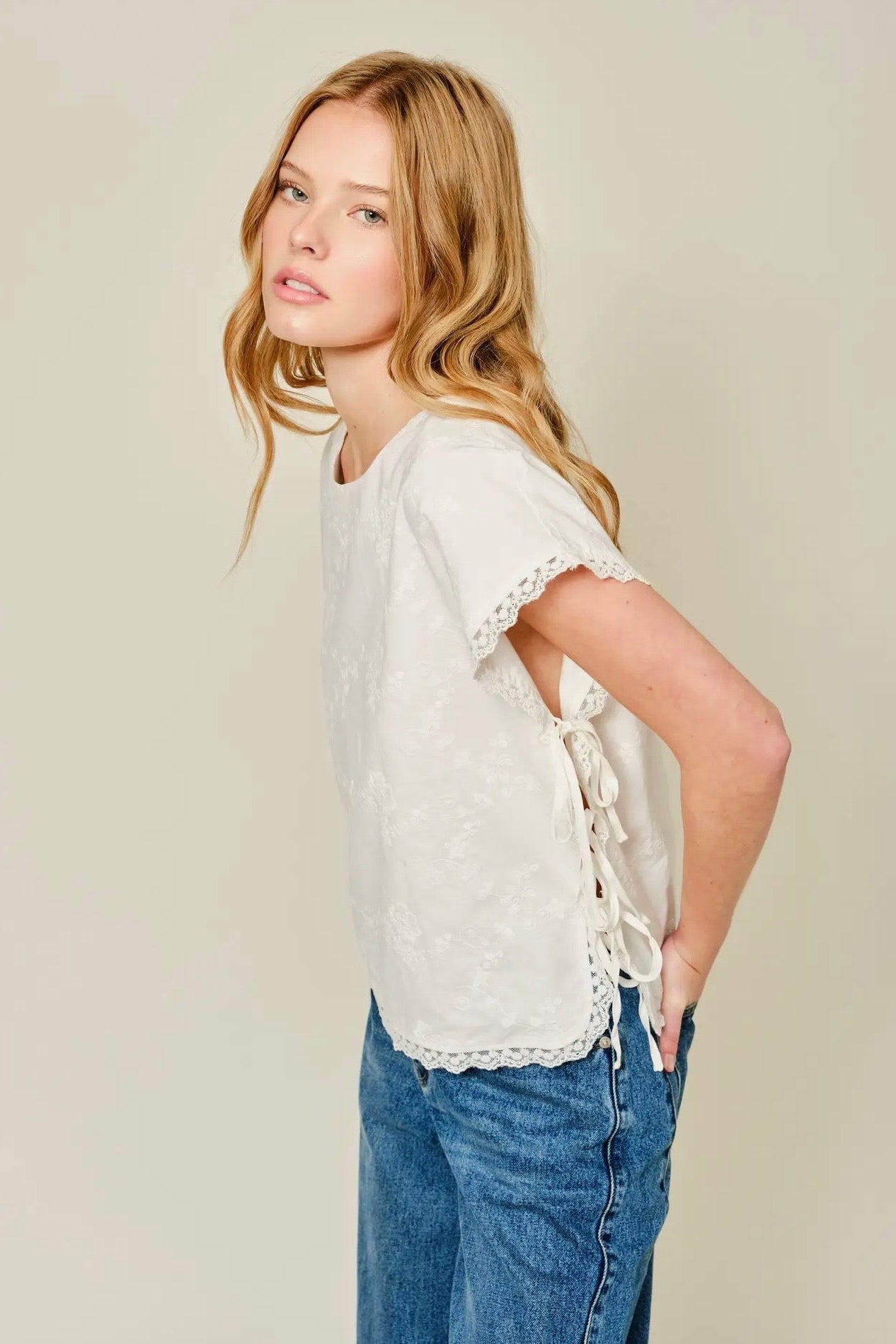 April says: I am 5'3", weigh 125 pounds, wear a 36 B bra, and I wear a small in this top. The details are stunning and you get just a teeny tiny peek of skin on the side.