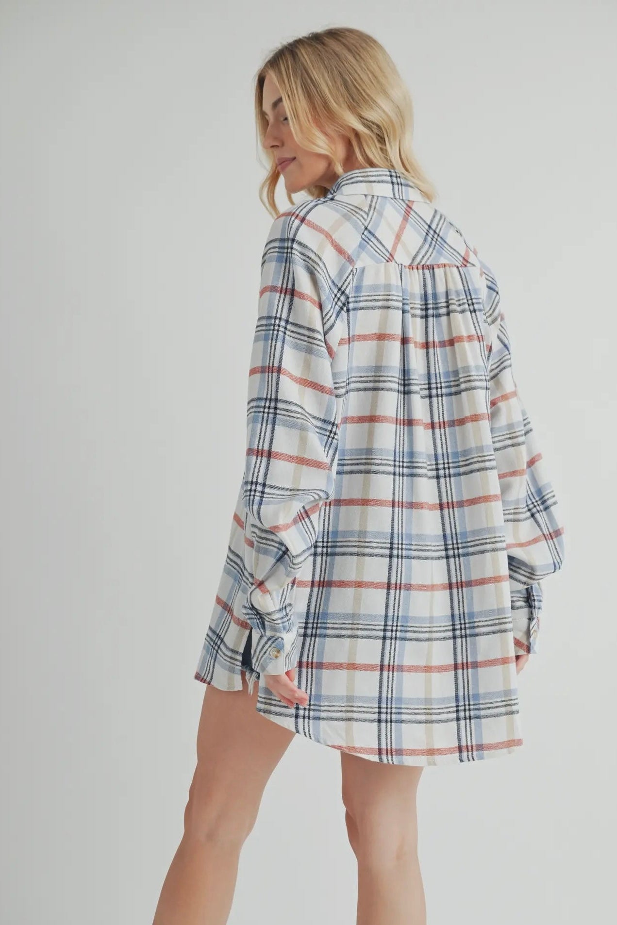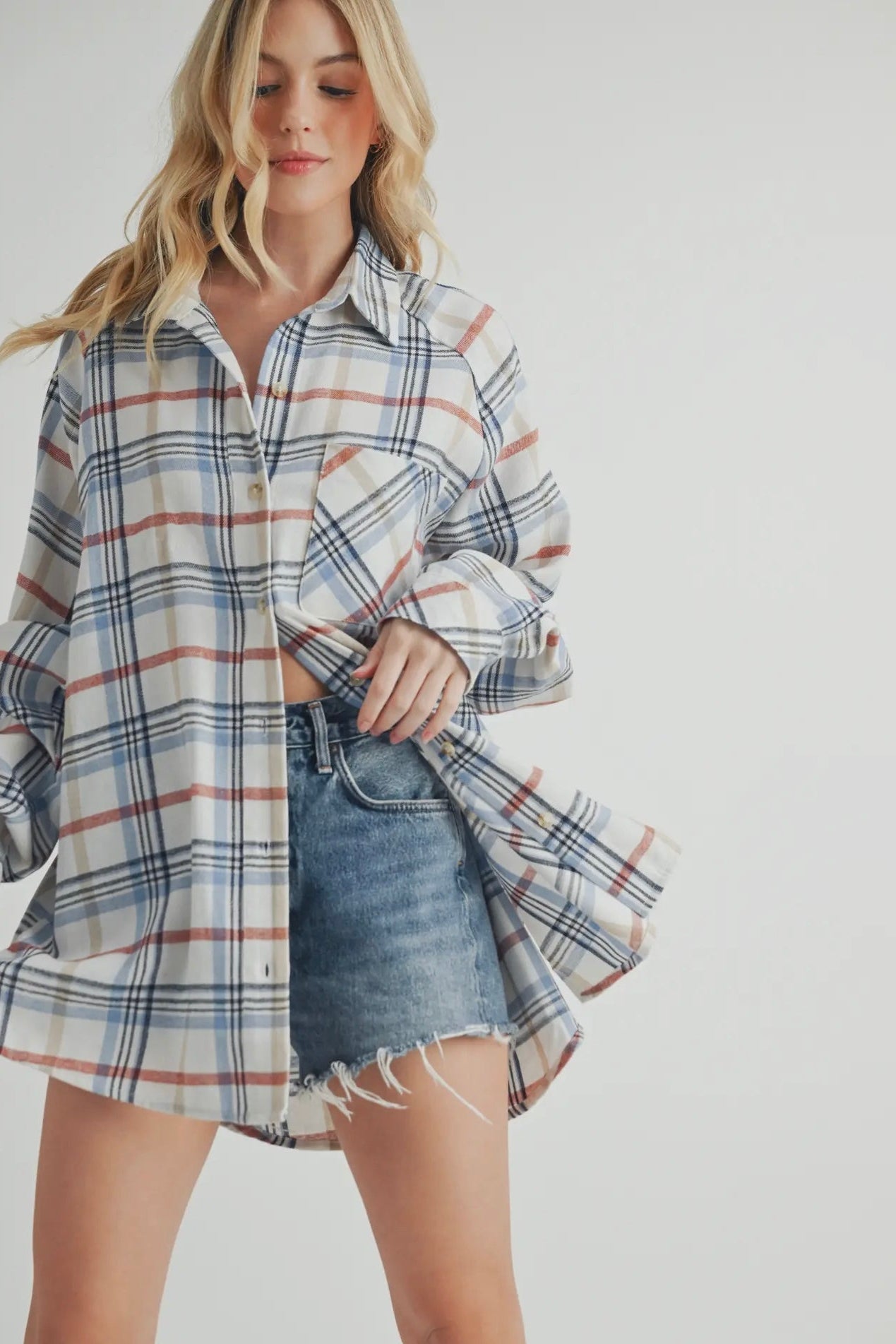 April says: I am 5'3", weigh 125 pounds, wear a 36 B bra, and I wear a small in this top. It's long + roomy on me, a plaid but not a full on flannel, and the colors are stunning!